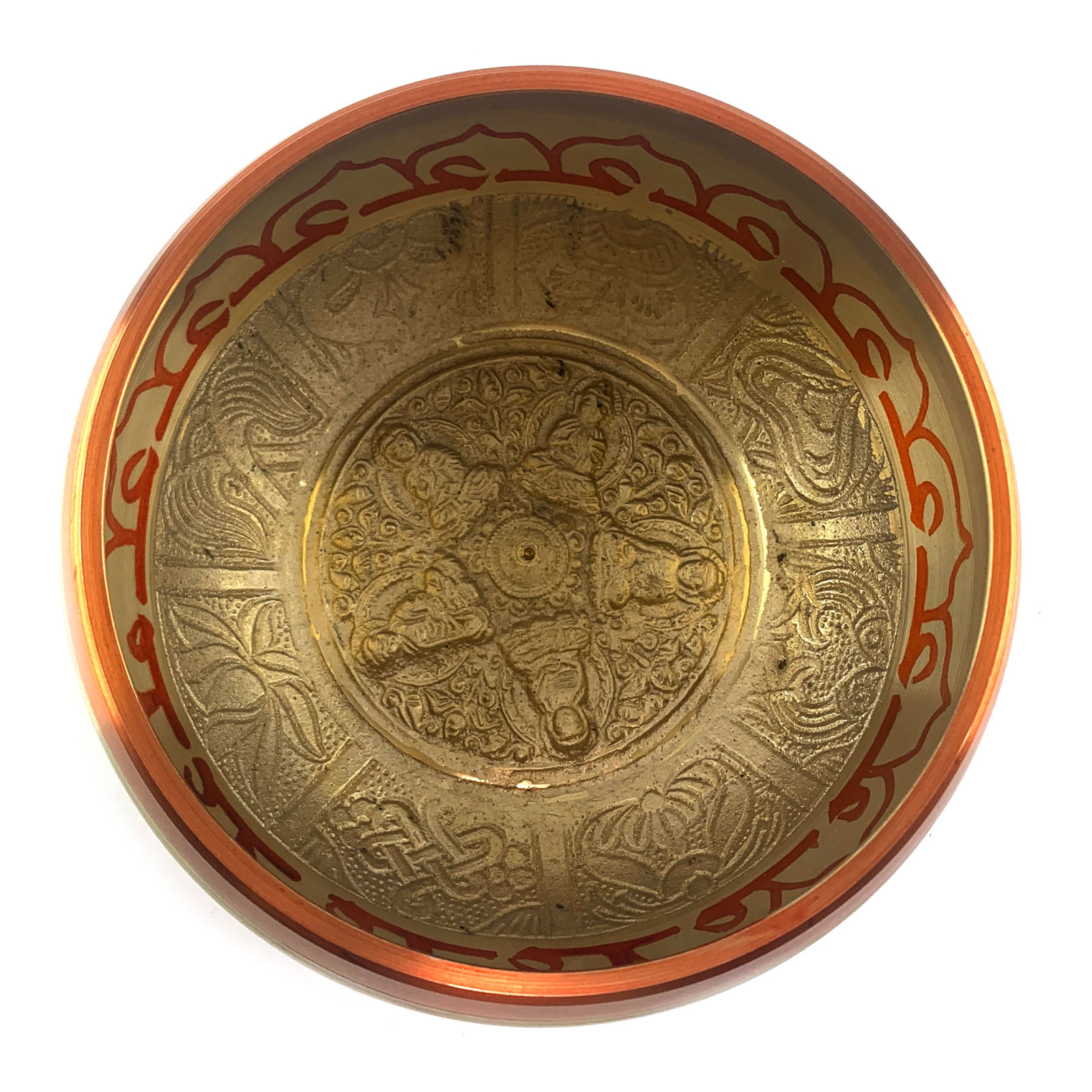 Эта великолепная бронзовая чаша, золотистого цвета , украшенная оранжевыми надписями, а внутри изображения пятерых Будд. Снаружи украшена традиционными индийскими надписями, создавая атмосферу духовного вдохновения.