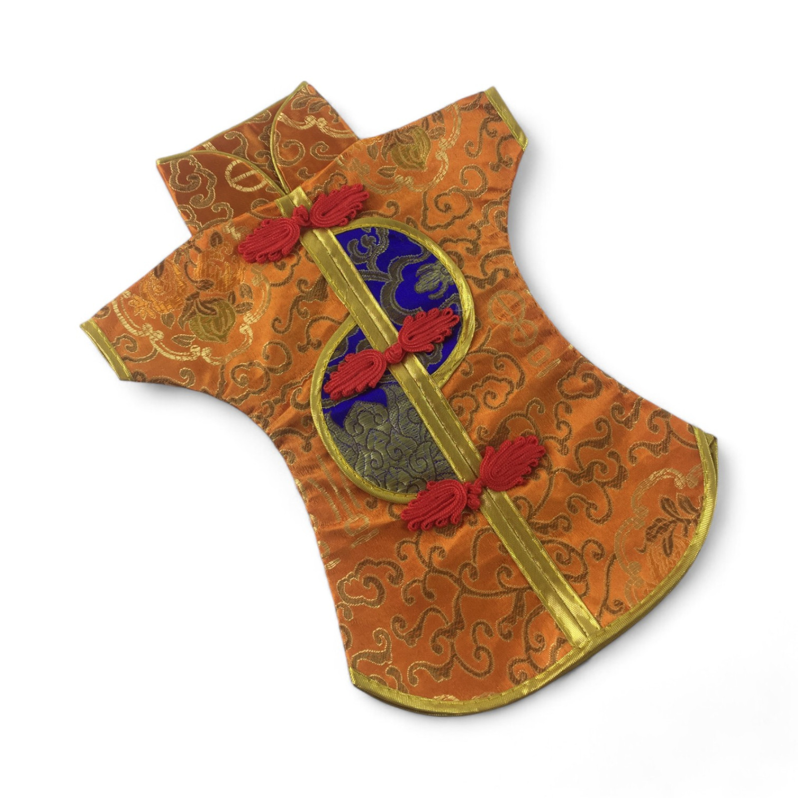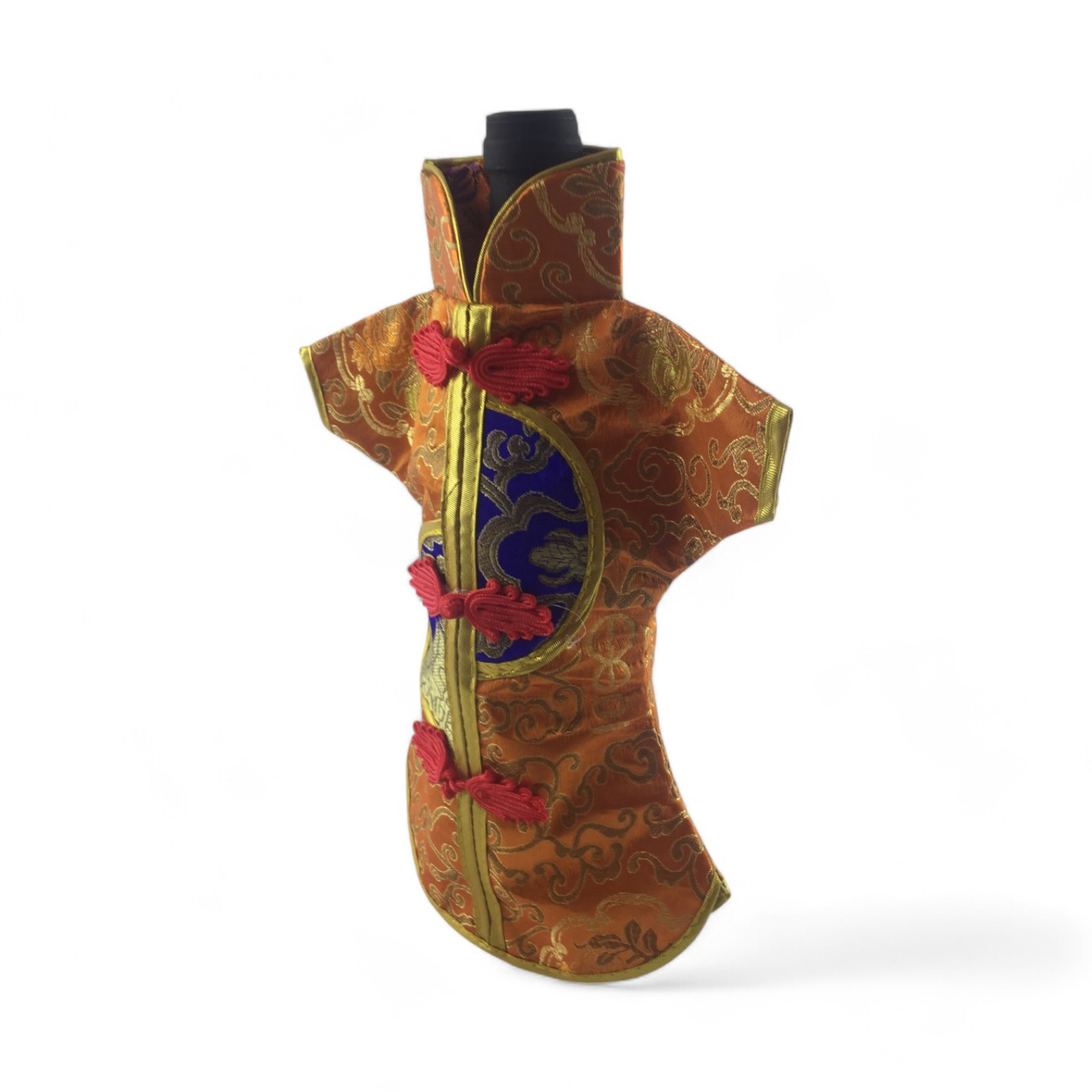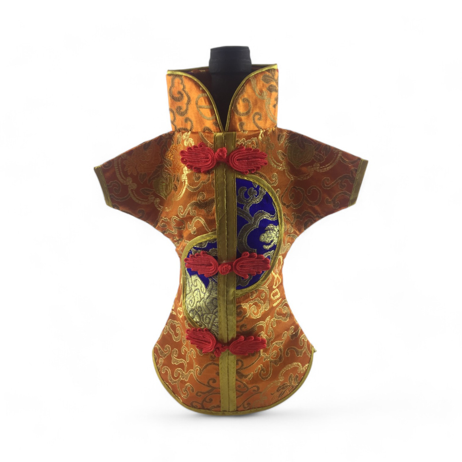 Этот элегантный чехол на бутылку выполнен в традиционном восточном стиле и напоминает миниатюрное кимоно. Он изготовлен из прочной ткани с ярким орнаментом, включающим символы и изображения, типичные для восточной культуры.