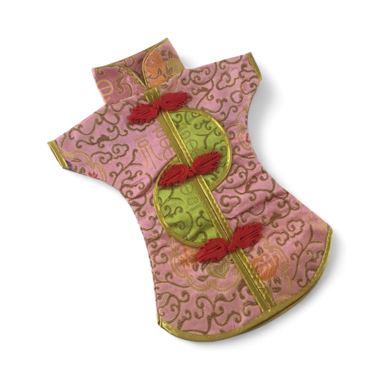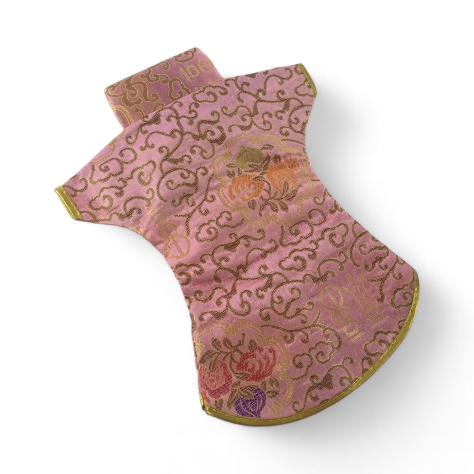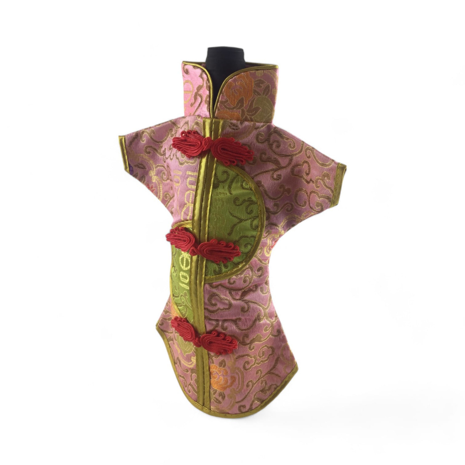 Этот элегантный чехол на бутылку выполнен в традиционном восточном стиле и напоминает миниатюрное кимоно. Он изготовлен из прочной ткани с ярким орнаментом, включающим символы и изображения, типичные для восточной культуры.