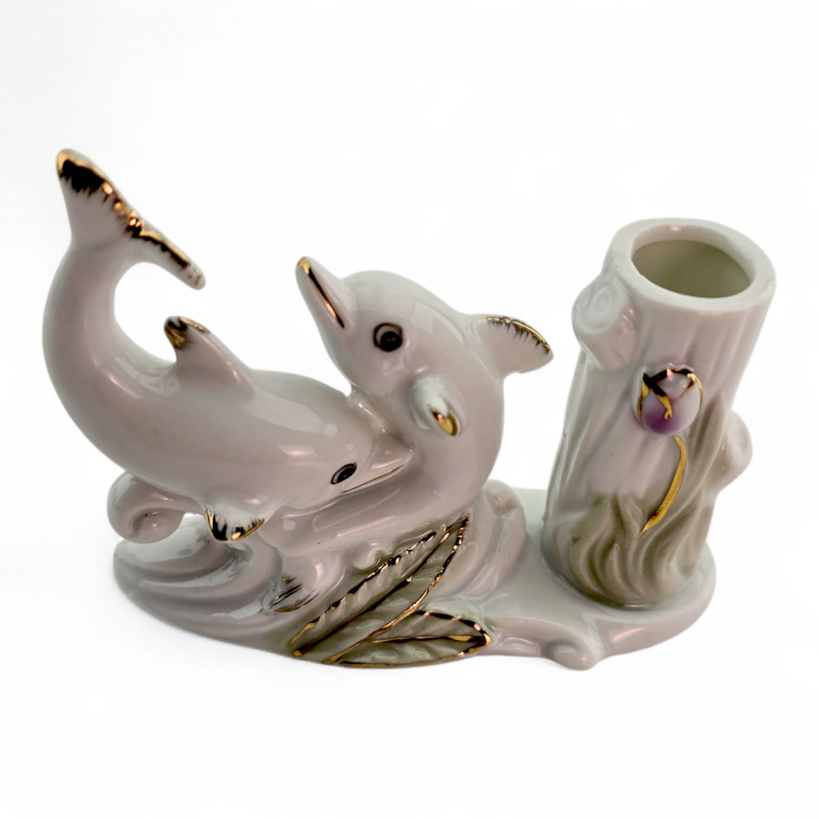 Декоративная фарфоровая подставка для зубочисток с фигурками дельфинов. Цилиндр удобно помещает стандартные зубочистки; при желании можно поставить 1–2 сухоцвета или ароматическую палочку. Глянцевая глазурь и золотистые акценты делают изделие аккуратным настольным декором и приятным подарком.