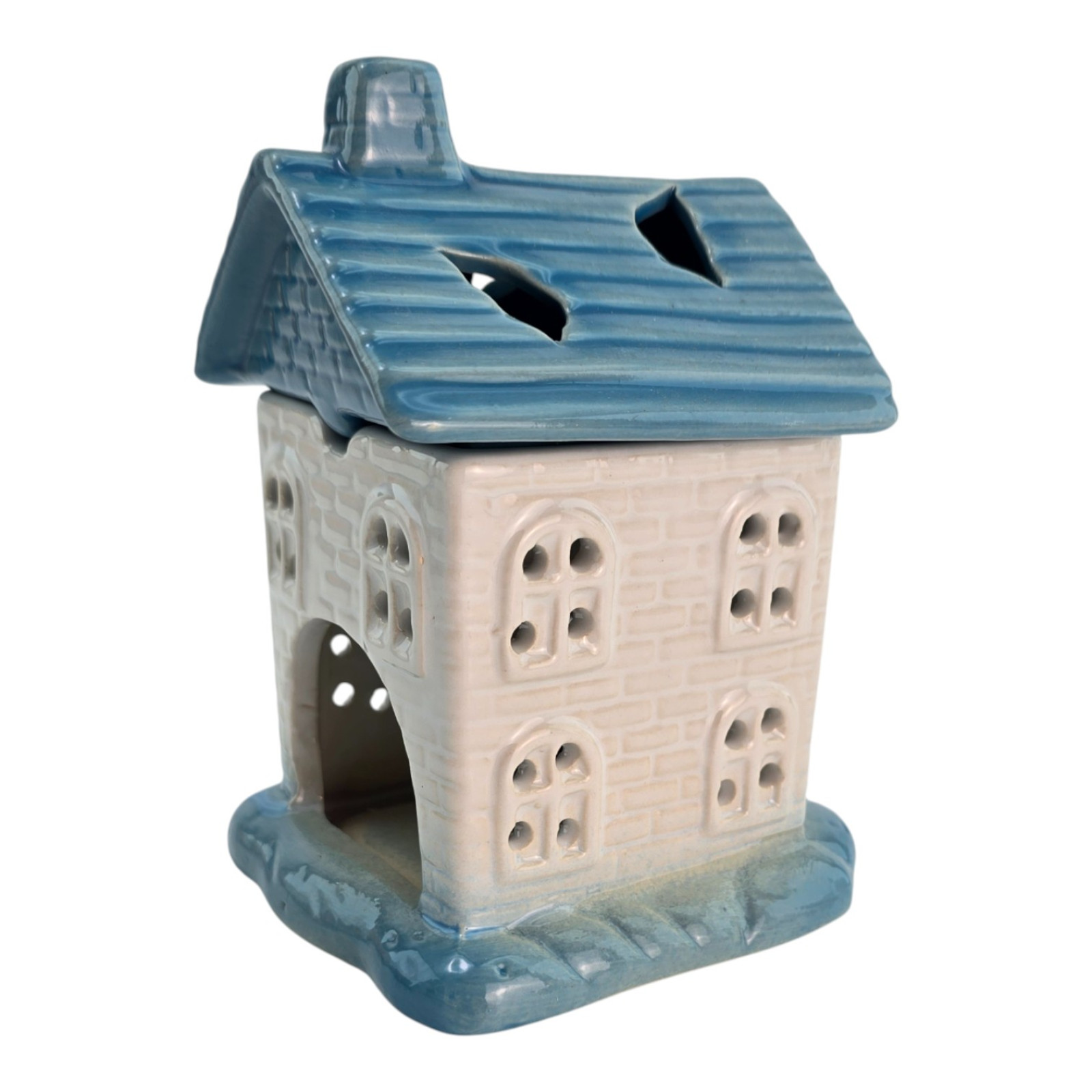 A ceramic aroma lamp shaped like a small house with white walls and a blue roof. A tea light candle is placed at the bottom, and a bowl of water with essential oil or wax sits above, under a removable roof. When the candle burns, light beautifully filters through the windows and slits in the roof, creating a soft, cozy glow.