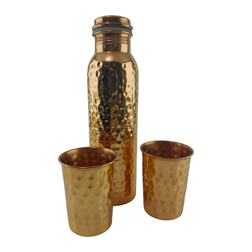 Bring elegance and sparkle to your everyday ritual with this unique set that includes a copper bottle and two glasses. Exquisite design combined with the nobility of copper will make your drinking experience special.