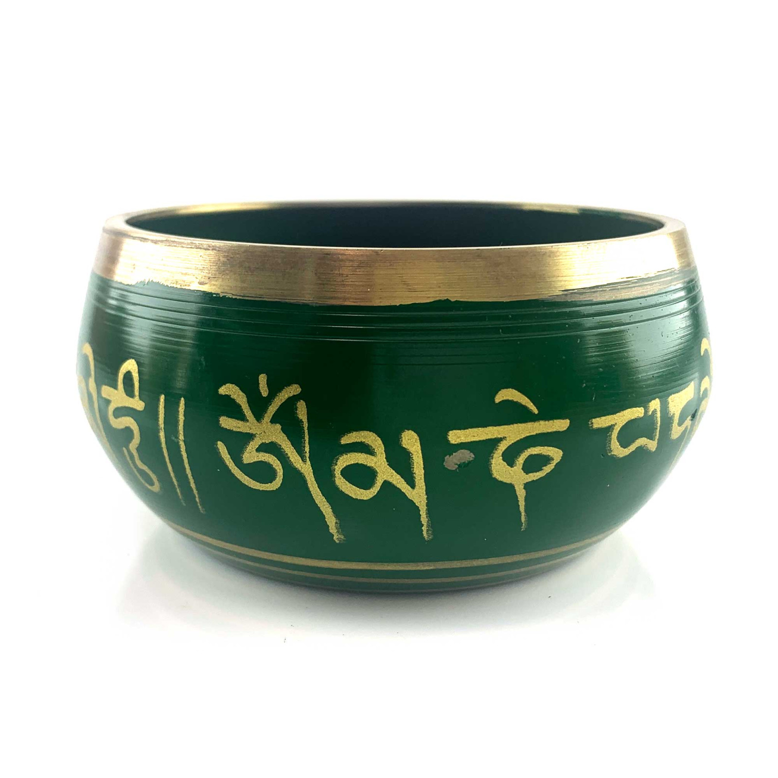 Singing Bowl Bronze Buddha Green (10.1 x 9.2 x 4.9 cm) Delve into a world of meditation and peace with our bronze green singing bowl, decorated with an elegant image of Buddha inside and golden Indian inscriptions on the outside. This amazing bowl not only creates harmonious and peaceful sounds, but is also a true work of art that fills the space around you with spiritual energy and positivity. The inside is decorated with a delicate image of Buddha, giving the bowl a special spiritual aura and mystical atmosphere. An elegant and sophisticated bowl design that combines traditional elements with modern trends. Suitable for meditation, relaxation, sound therapy, ceremonies and as a unique decorative element for your home or office. This bowl is not just a musical instrument, it is a source of spiritual harmony and inner peace. The combination of great sound, beautiful design and attention to detail makes it the perfect choice for those looking for something special. Immerse yourself in a world of sound and beauty with our Bronze Green Singing Bowl and discover the peace it brings to your life. Characteristics: Dimensions: Height 49 mm, Width 101 mm, External diameter 92 mm, Internal diameter 83 mm. Green color. Weight: 325 gr. Production: India.
