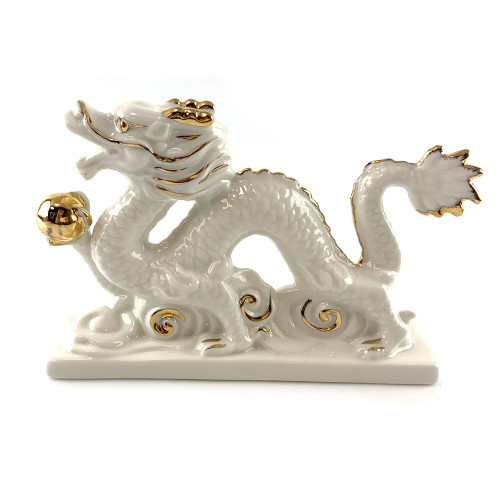 The porcelain dragon in white with gold details is not just a decoration, it is a work of art that embodies sophistication and elegance. The dragon stands as a guardian over your space, symbolizing strength and durability.
