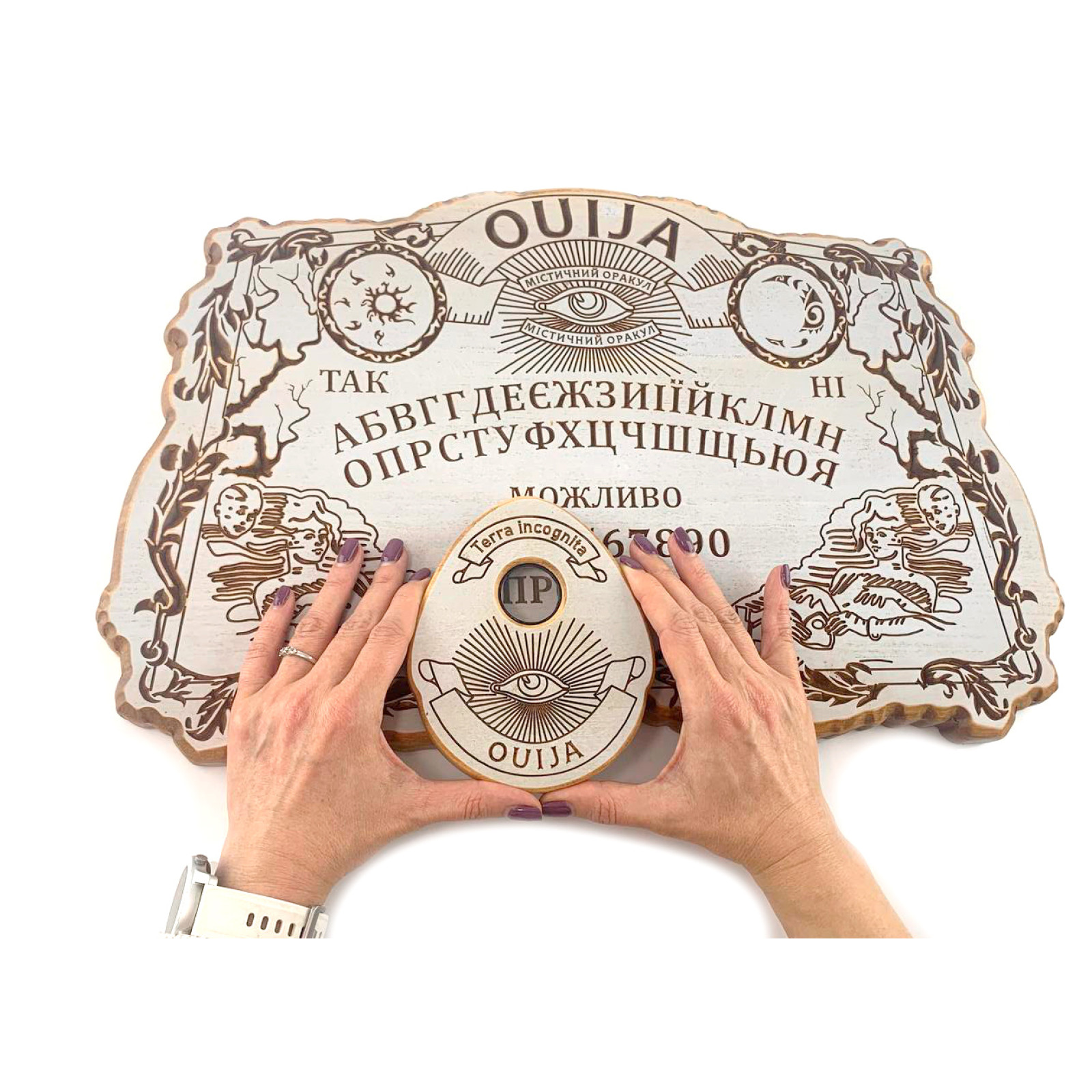The carved wood Ouija board celebrates ancient mysteries with a beautiful antique influence. Every detail is carefully carved, recreating images from the past. The magnifying glass built into the pointer allows you to see the smallest details and mysterious symbols, revealing to you the secrets of ancient times. This piece of art will become not only a tool for communicating with another world, but also a magnificent decorative element.