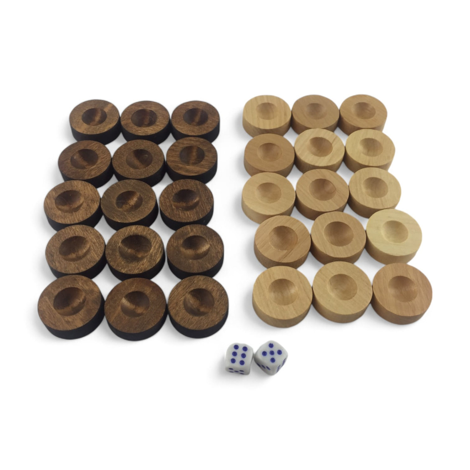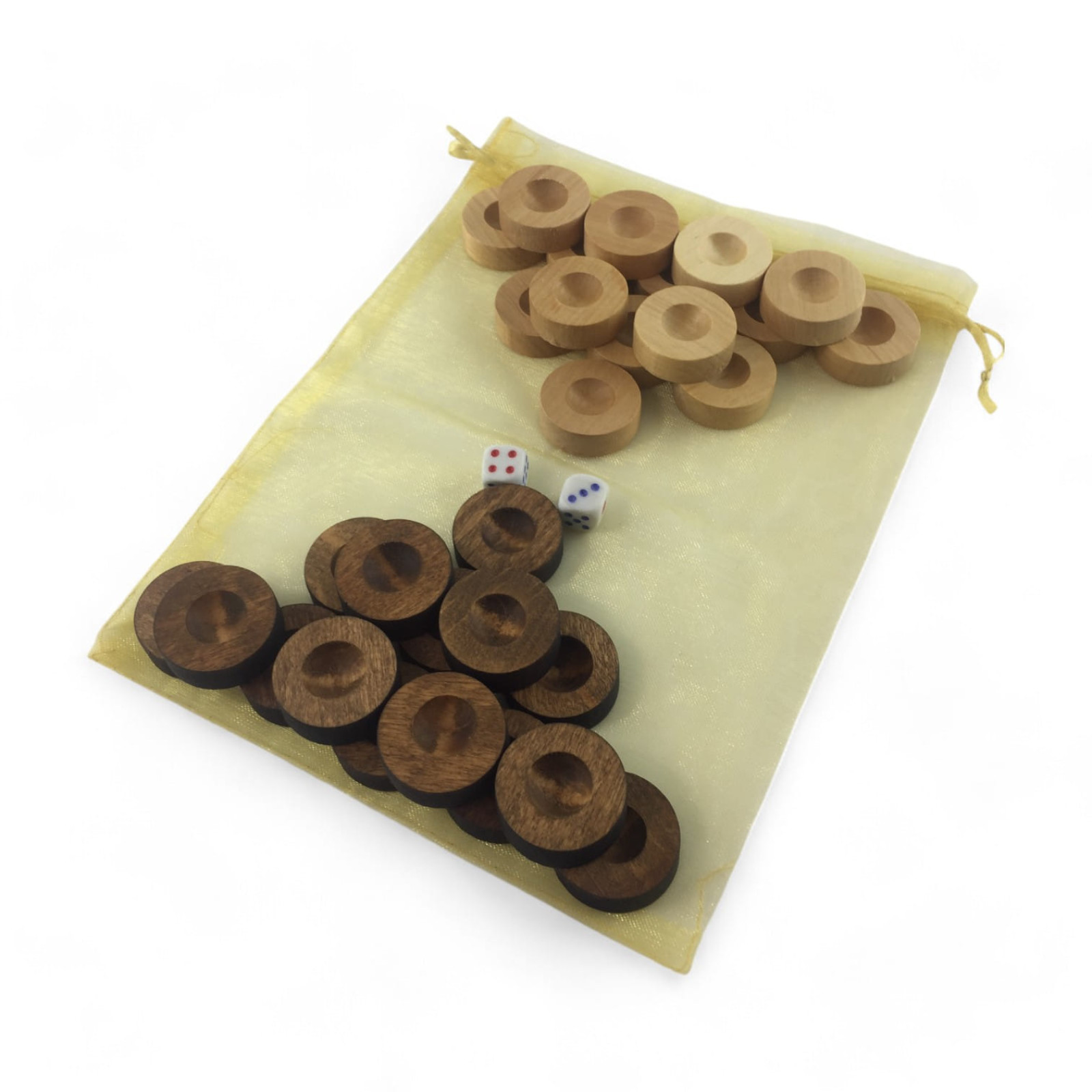 Description Backgammon chips with a bag (L-28mm, H-10mm), cubes included, natural wood and brown color.