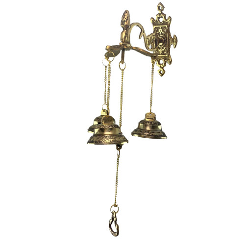 Bronze door bells (29x12.5x8 cm) These exquisite bells not only add charm to your home, but also bring with them a touch of antiquity and comfort. Handmade work and attention to detail make them unique works of art. These doorbells are the perfect addition to your home, creating a cozy and welcoming atmosphere. Every sound emanating from them fills the space with warmth and joy. Not only can they be a functional element to your door, but they can also be a stunning decorative accent to highlight your unique style. Let these bronze doorbells bring a touch of antiquity and a welcoming atmosphere to your home. Surprise your guests and enjoy every ringing sound, reminding you of the beauty of simple things. Characteristics: and Dimensions: Overall dimensions: Length: 290 mm Width: 125 mm Depth: 80 mm Bells: Diameter of the bells: 45 mm Number of bells on the pendant: 3 Length of the chain with bells: 95 mm Length of the longest chain with gong: 210 mm Material : Made of bronze, ensuring reliability and long service life. Weight: 239 gr. Manufacturer: India.