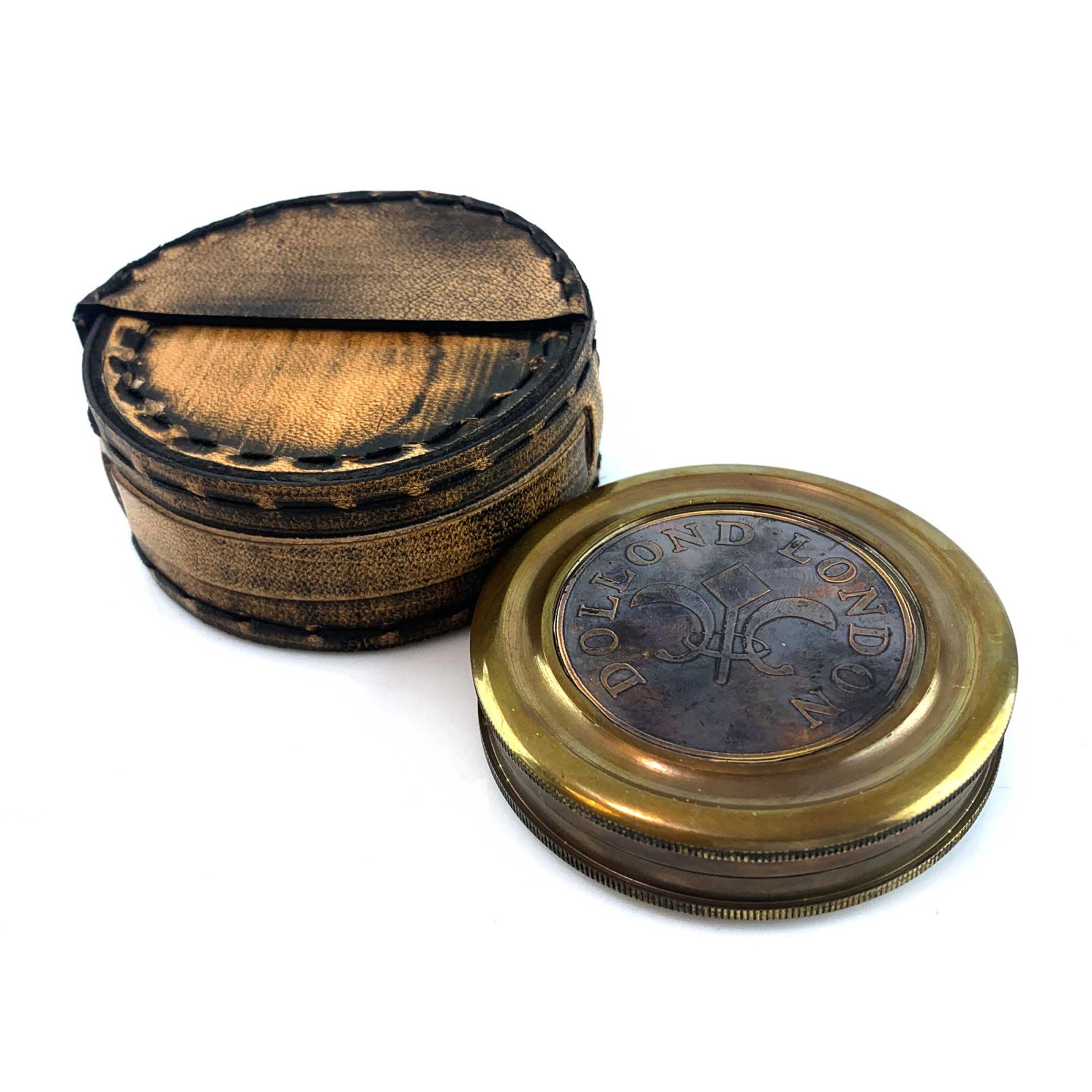 Description Bronze compass in a leather case "Dollond London" (8.7 x 3.5 cm)