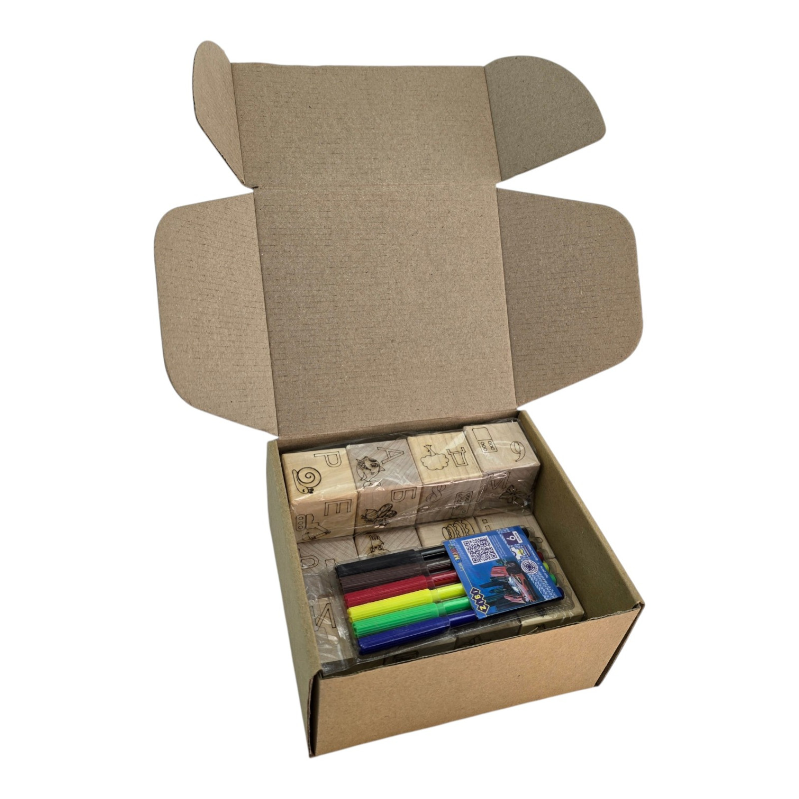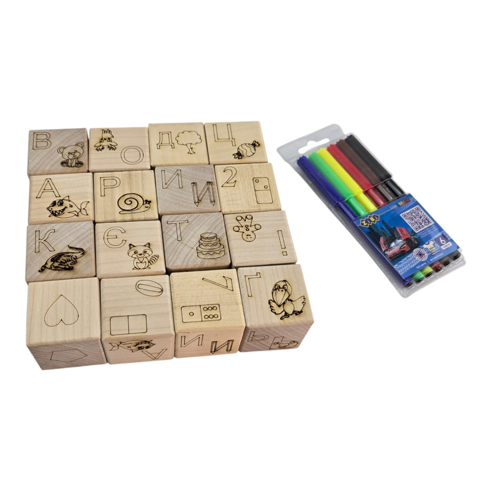 Description Wooden coloring cubes "Living Alphabet" (4x4 cm), (16 pcs. + markers).