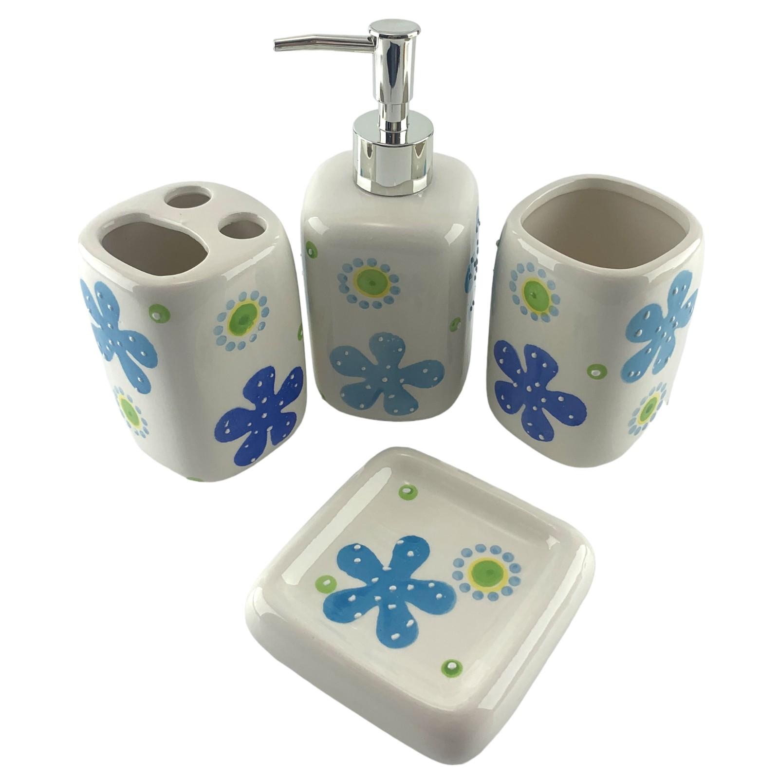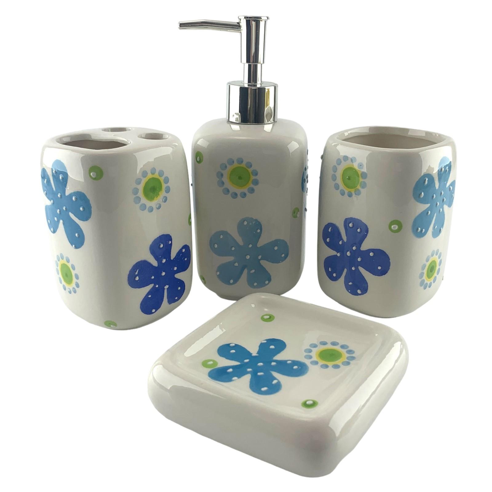 Enjoying every moment of your bathroom routine starts with the details. Our ceramic bathroom set will give your bathroom not only functionality, but also a unique style. Liquid Soap or Shampoo Dispenser (350ml): This dispenser is the perfect place for your favorite soap or shampoo. Stylish design and practicality come together in this compact accessory. A glass for rinsing the mouth. This glass is convenient to use both for rinsing after brushing your teeth and for storing other hygiene items. It adds color and coziness to your bathroom. Dental Hygiene Organizer: This organizer helps you organize your toothbrushes and other oral care accessories. It allows you to store all your important items in one place, making your routine more convenient. Soap Dish: The compact, uniquely designed soap dish provides a secure place for your soap to always be dry and ready to use. Blue flowers of different shades give the set a special style. Every detail of this set is designed with practicality in the bathroom in mind. Transform your bathroom into a place of relaxation and coziness with this ceramic set. Add it to your bathroom and enjoy functionality and beauty every morning and evening.