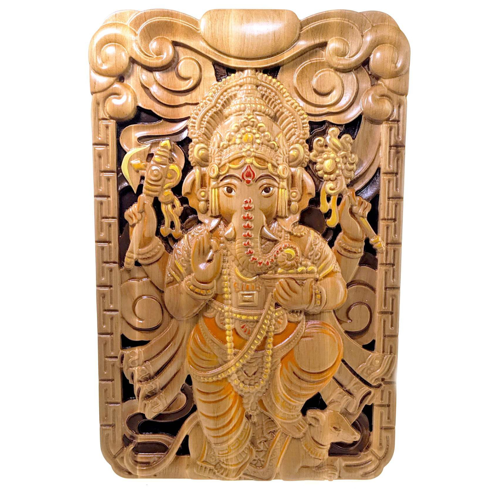 Specification Panel "Ganesha", carved, (42.5x28x2 cm) solid wood, covered with patina, enamels and varnish.