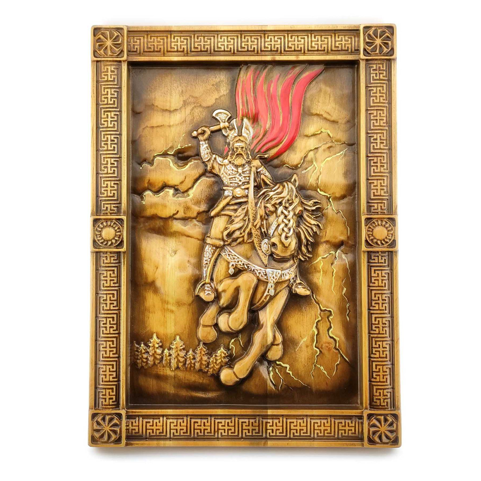 Specification Panel "Perun" (39x29x2.4cm) solid wood, carved, covered with patina, varnish, hand-painted with enamels.