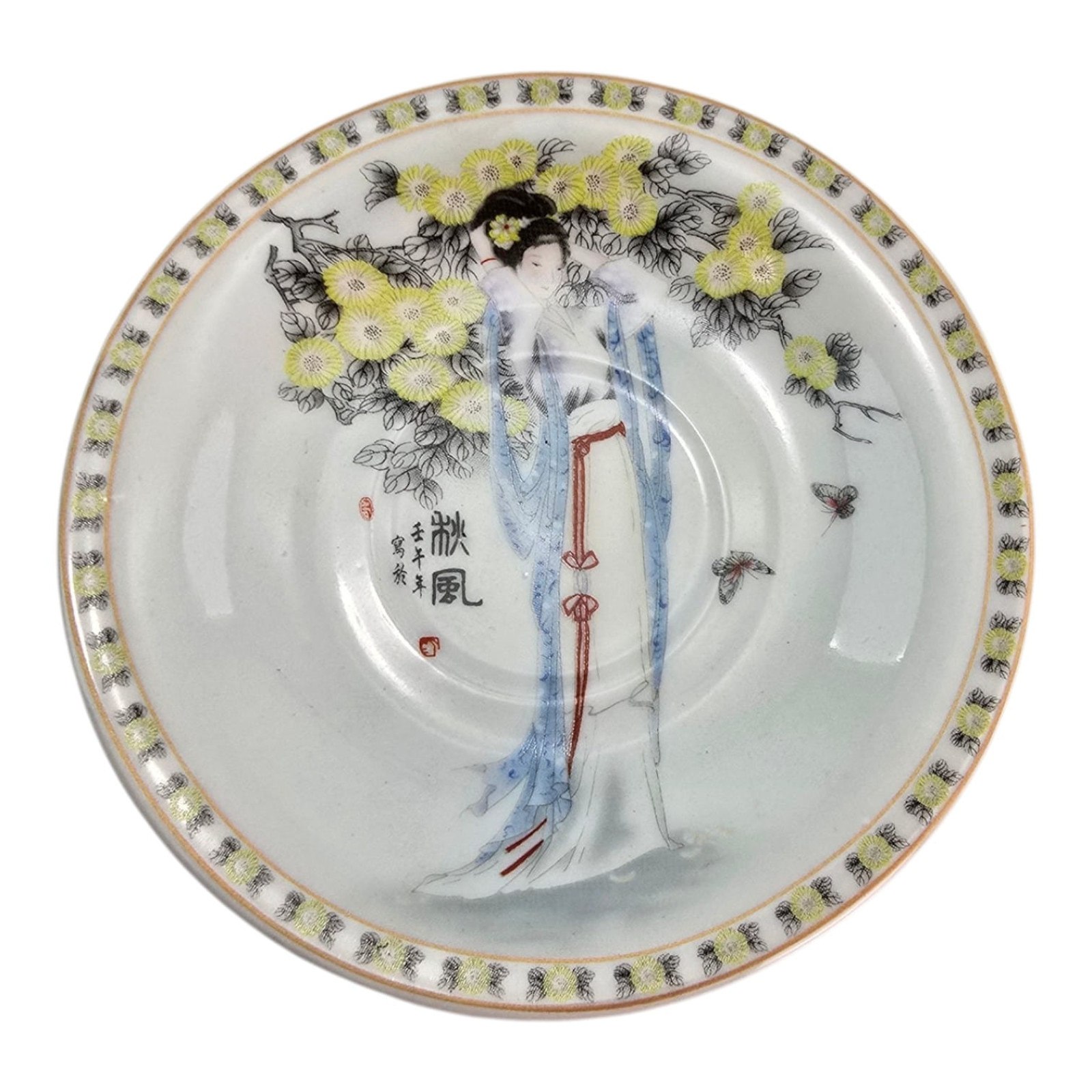 Each cup and saucer is decorated with delicate Japanese designs on a white background: traditional kimono-clad girls amidst blossoming trees and butterflies. A delicate gold ornament rims the rim.
