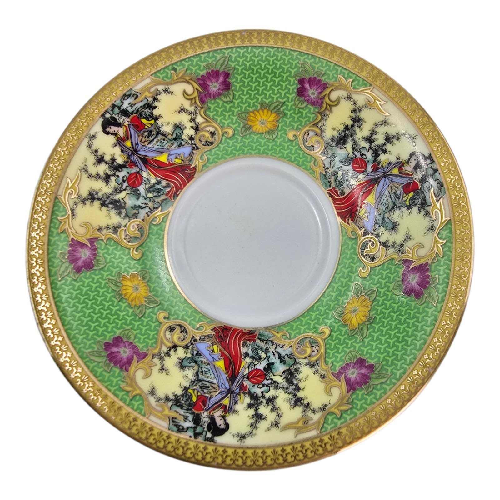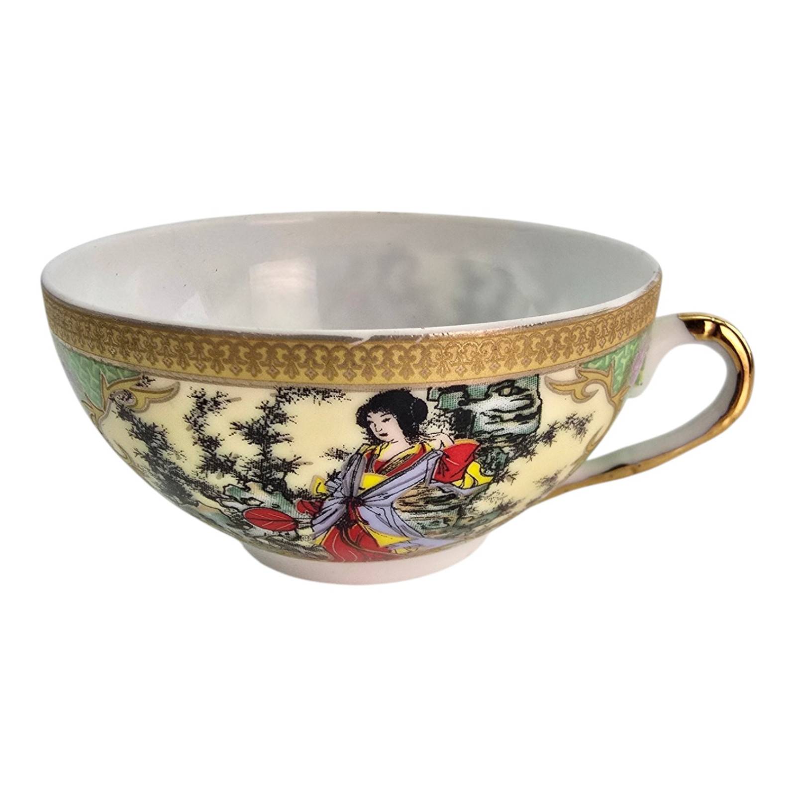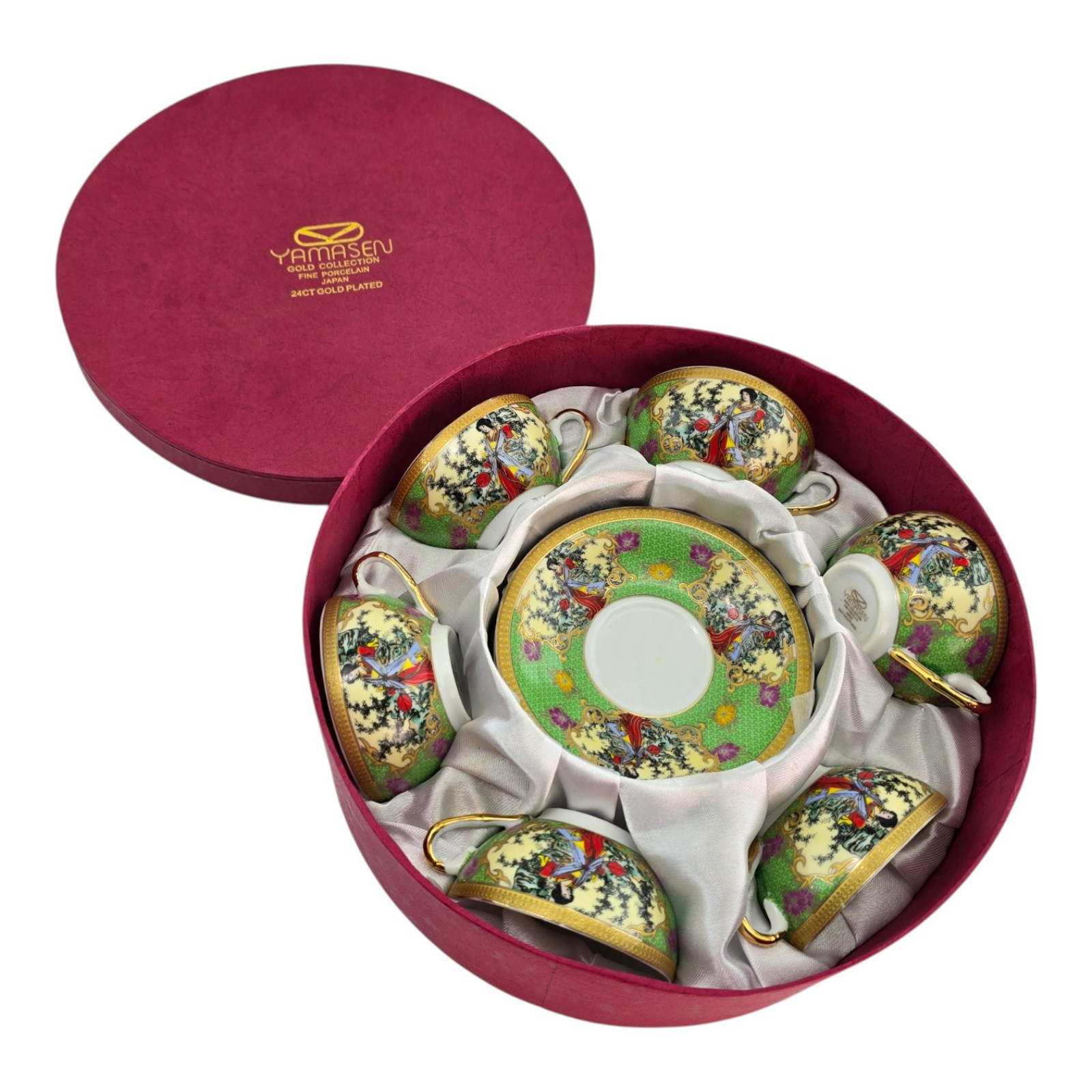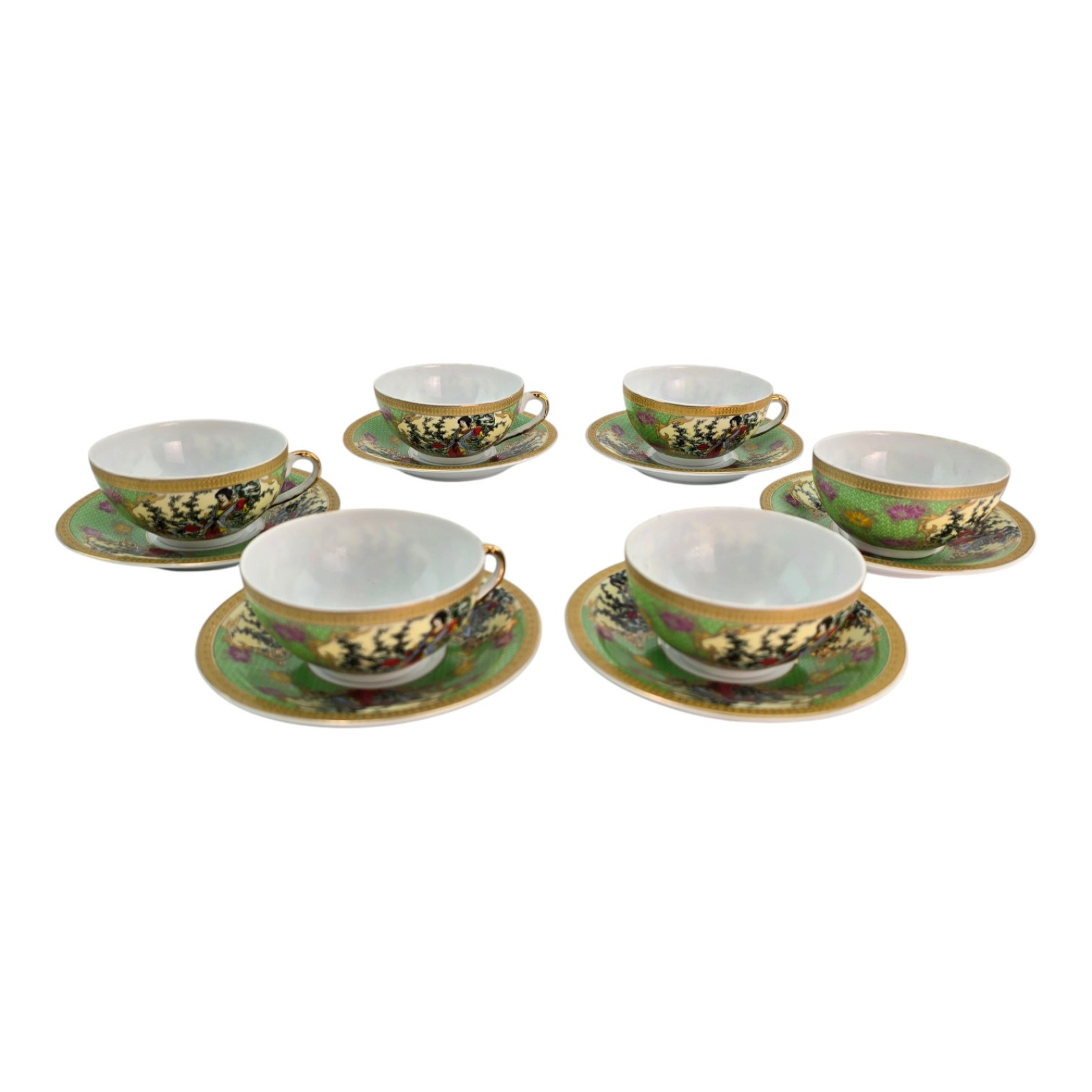 Each cup and saucer is decorated with vibrant Japanese designs on a green background: traditional kimono-clad girls among flowers and trees. A rich gold ornament rims the rim.