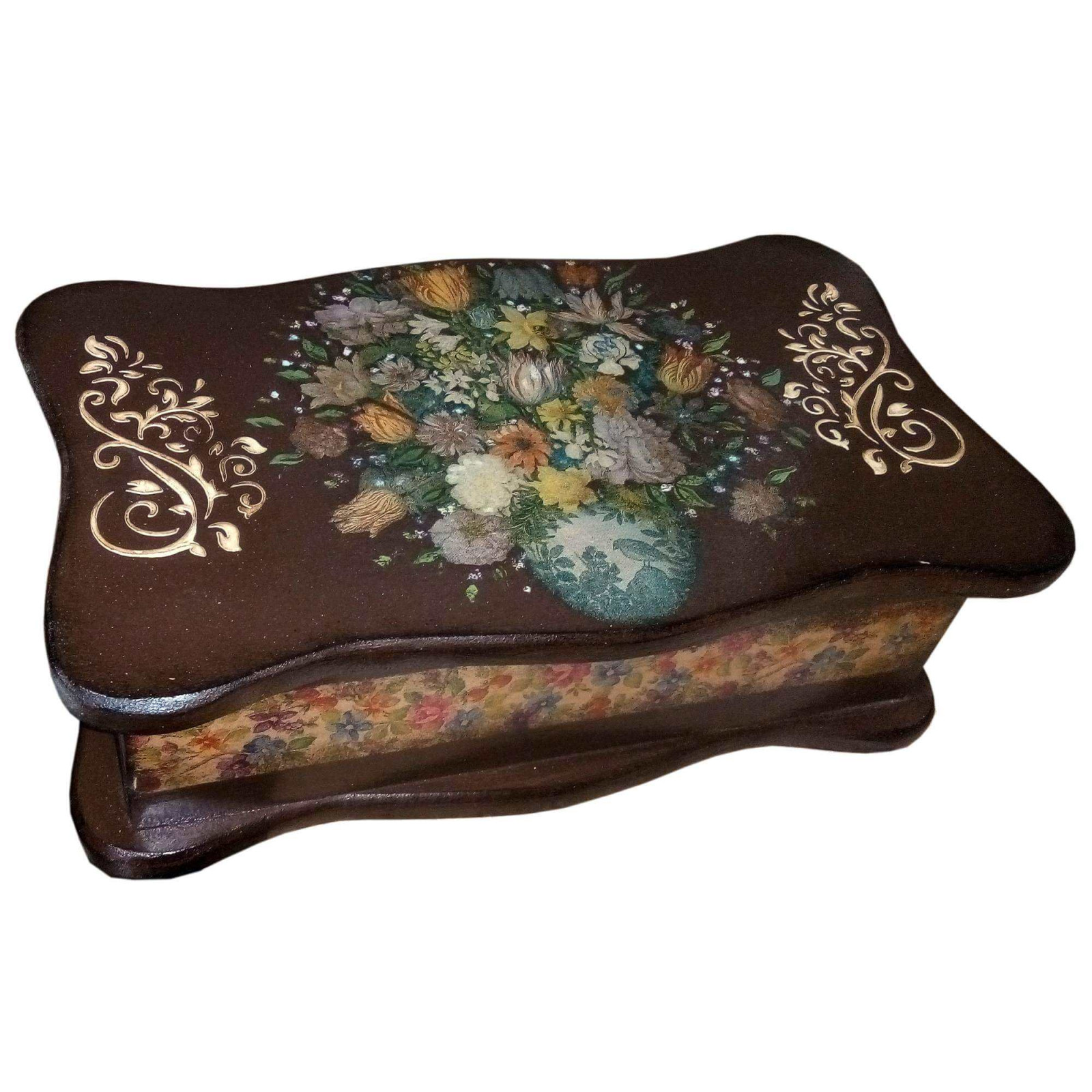 Box with a figured lid "Flowers" brown, solid wood (26.5x15.5x9.5 cm.)