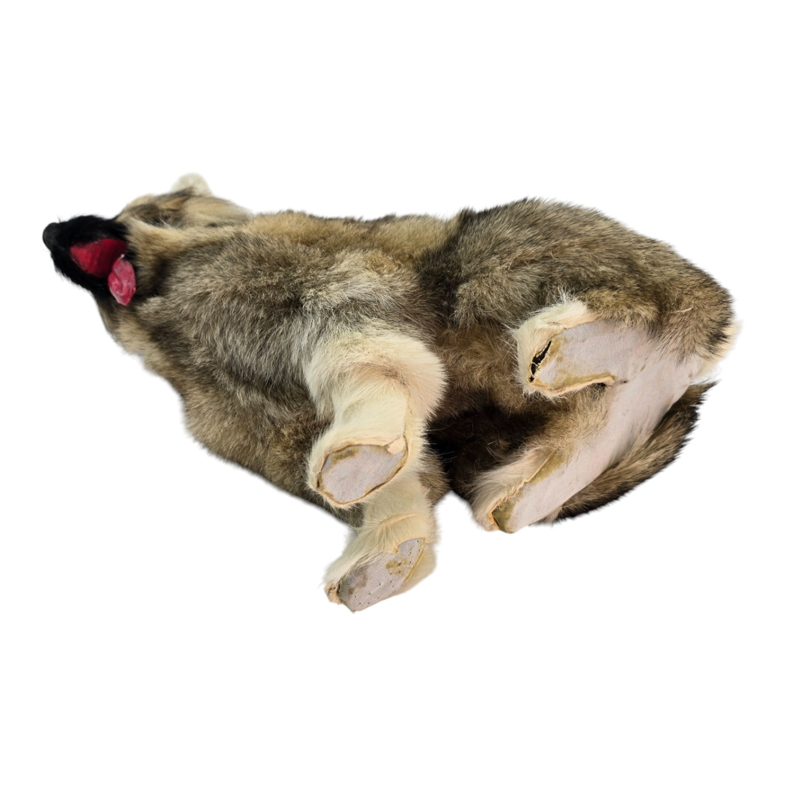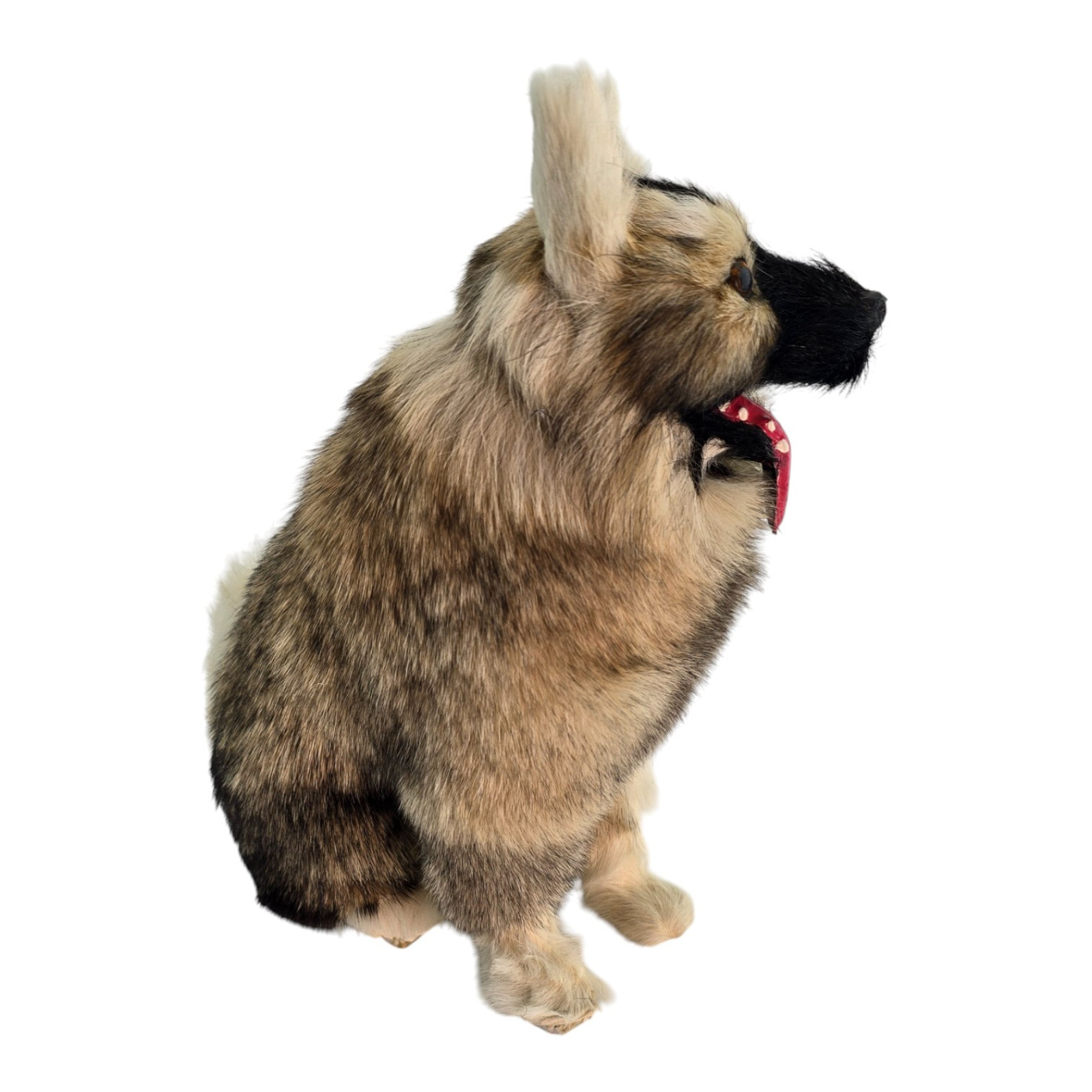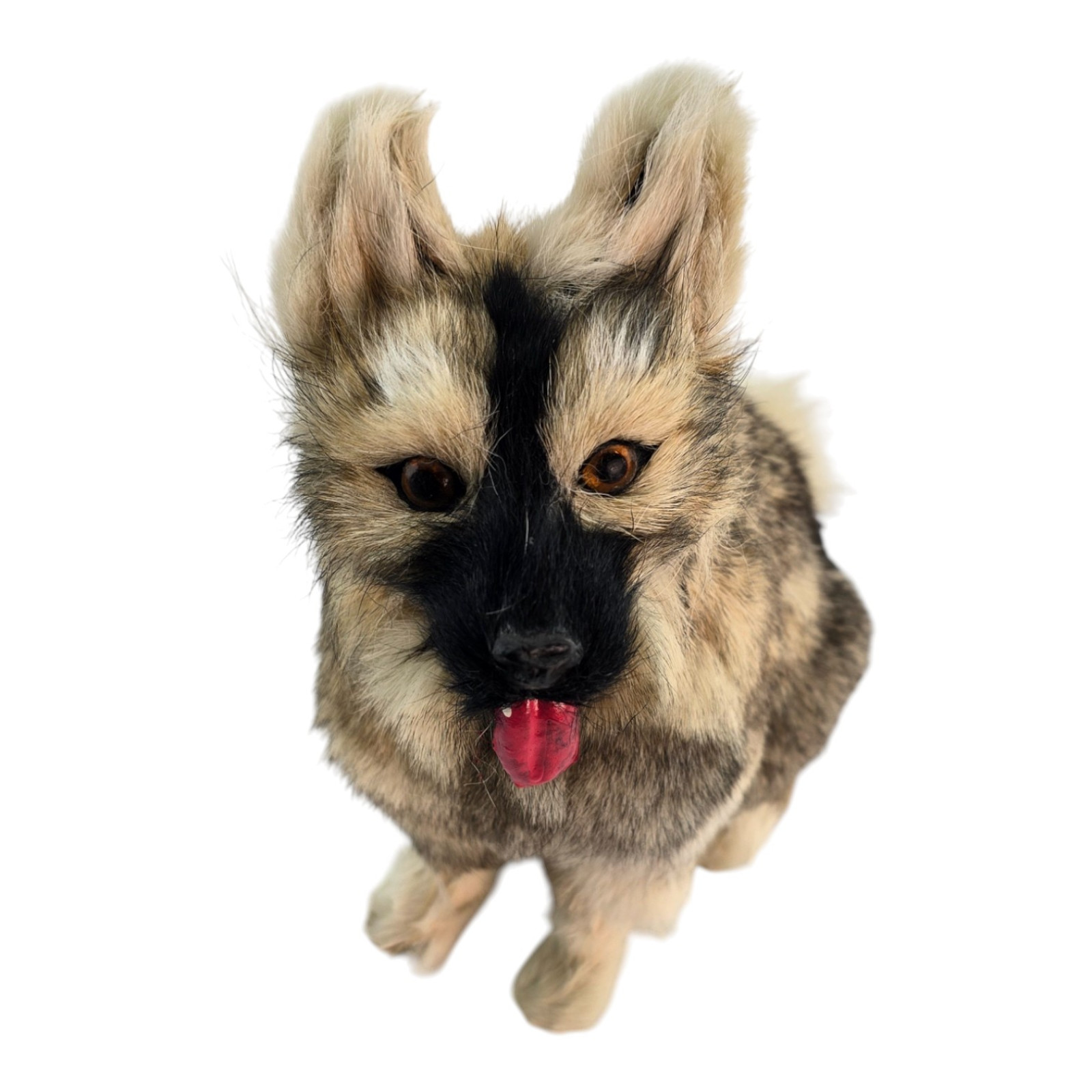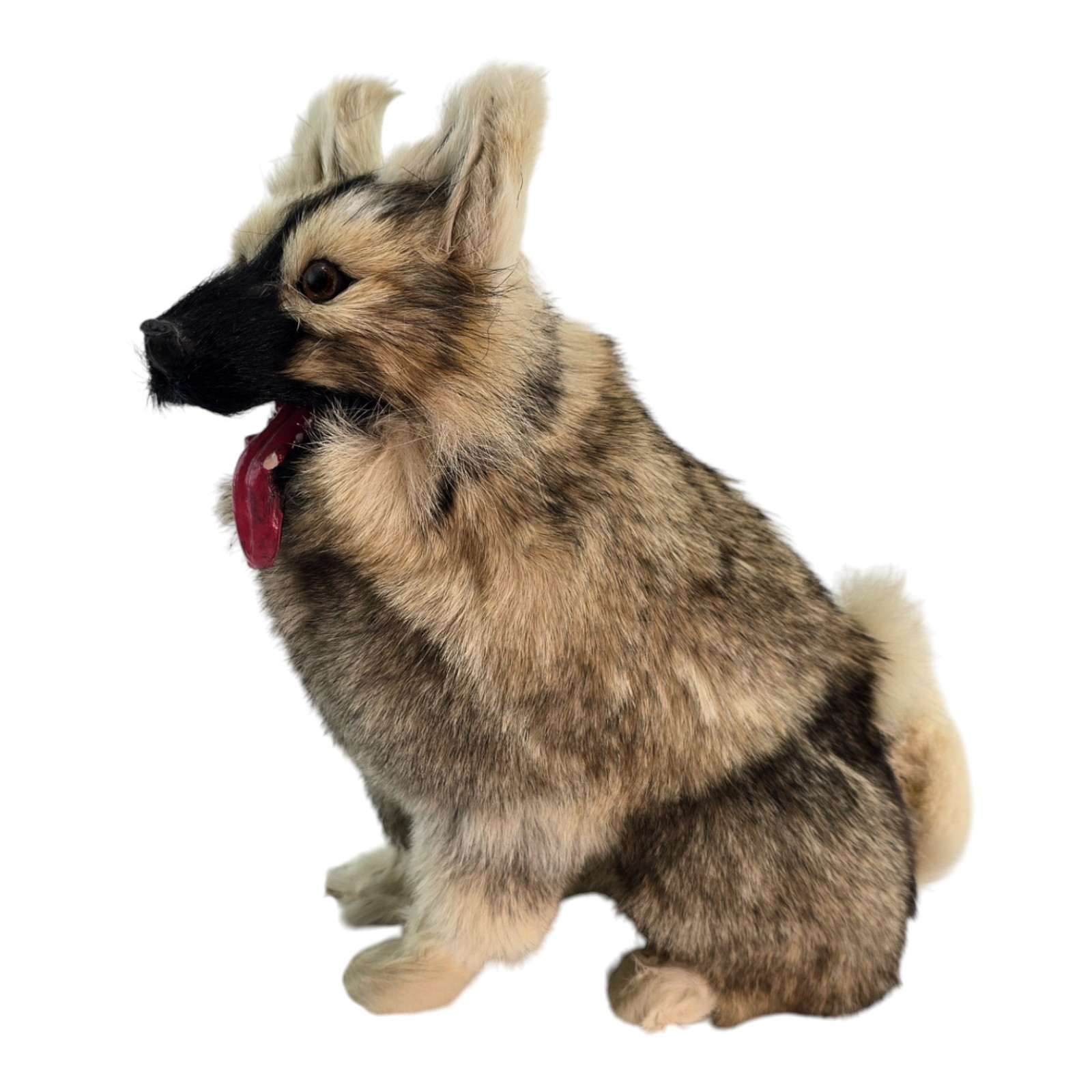 A realistic soft toy in the shape of a cute dog with its tongue hanging out. Made of genuine fur, the texture and color may vary slightly—a natural characteristic of natural materials. Perfect as an unusual gift, souvenir, or home decor, for photo booths, or display cases.