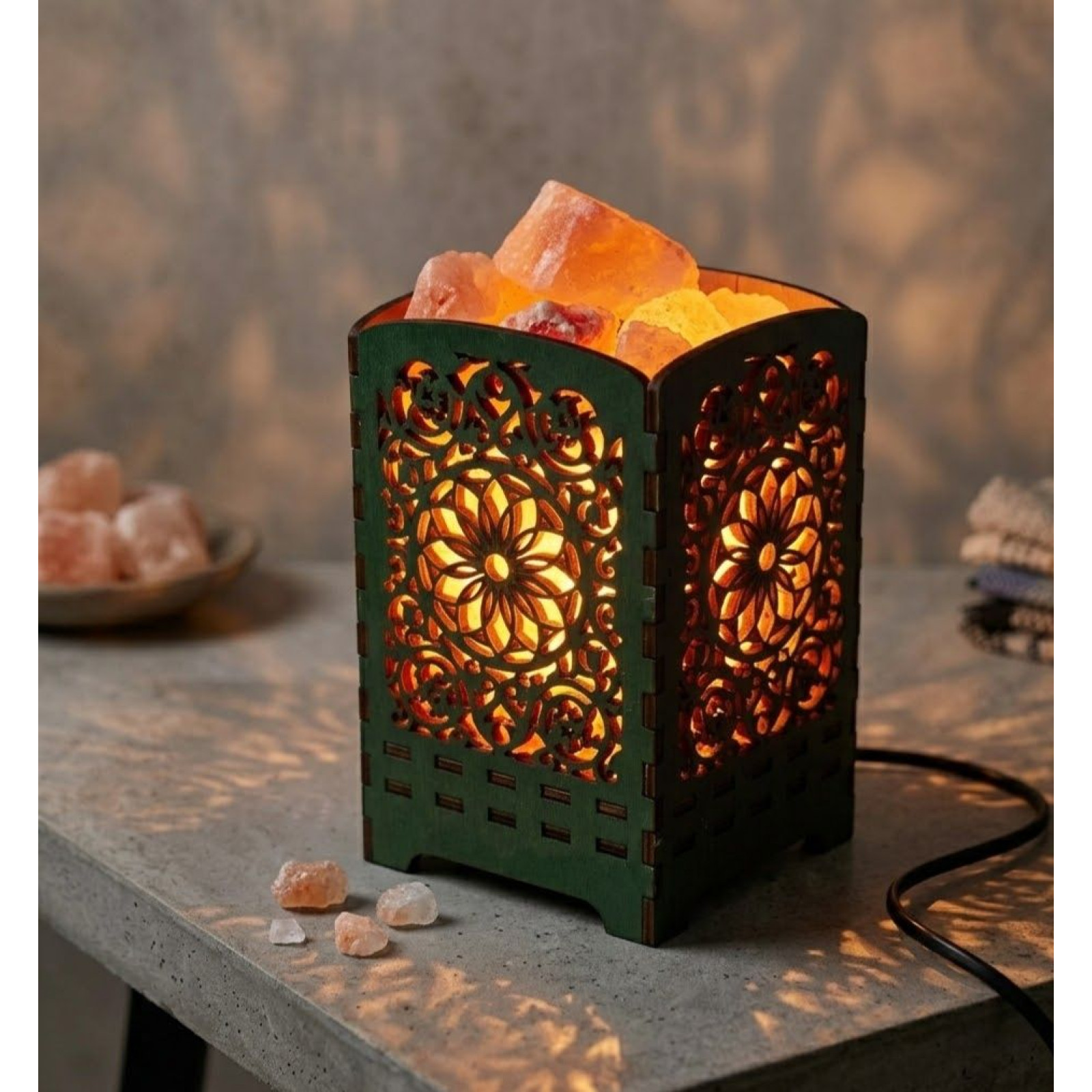 The lamp features a wooden frame with an elegantly carved mandala pattern. When turned on, light passes through Himalayan salt crystals and decorative carvings, creating a beautiful pattern and a warm, soft glow.