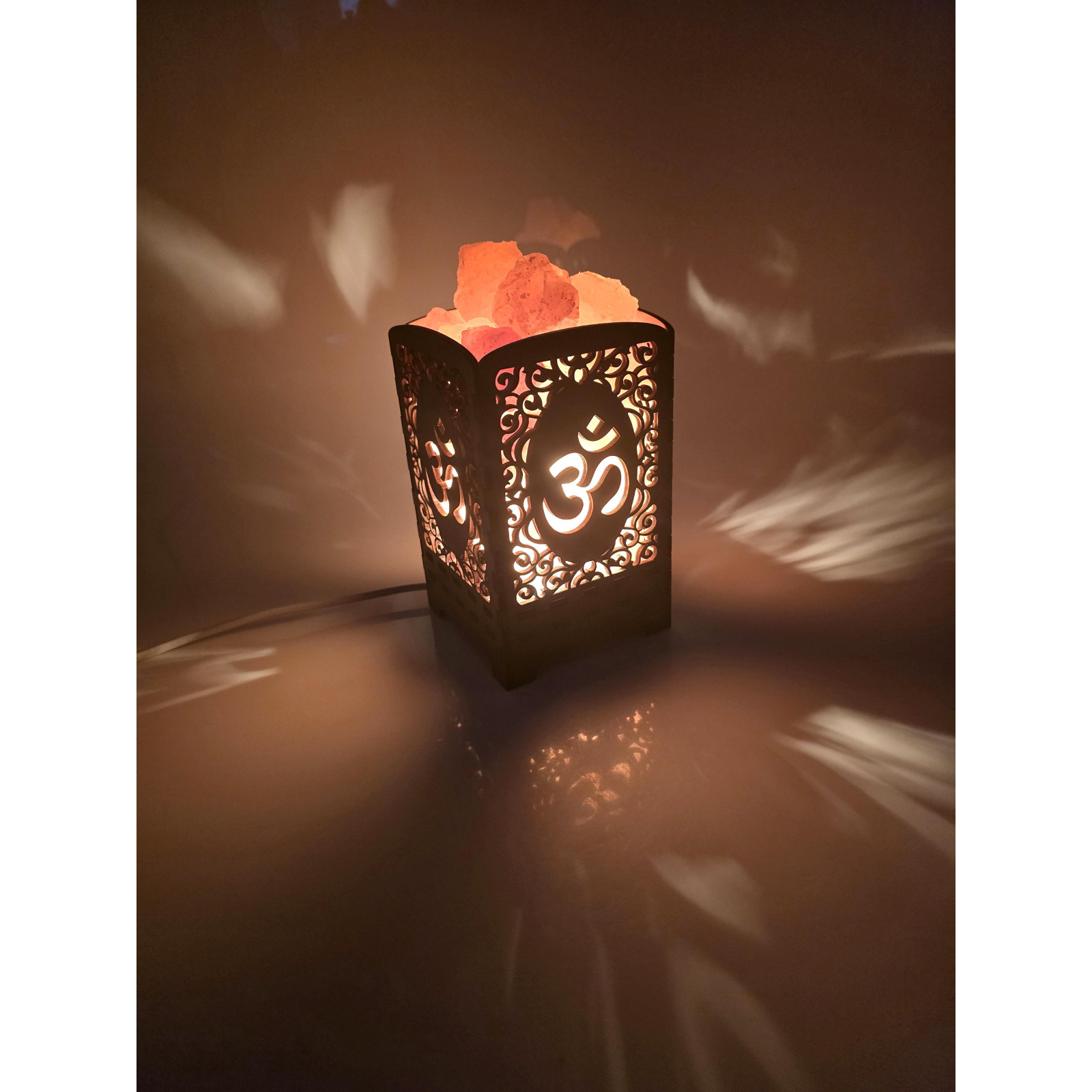 The dimmer cord allows you to easily adjust the brightness of the light, while the slits and OM symbol create a magnificent glowing effect, making the lamp ideal for both nighttime lighting and as a decorative element in any interior. May this Himalayan salt lamp bring not only light but also peace and harmony to your home.