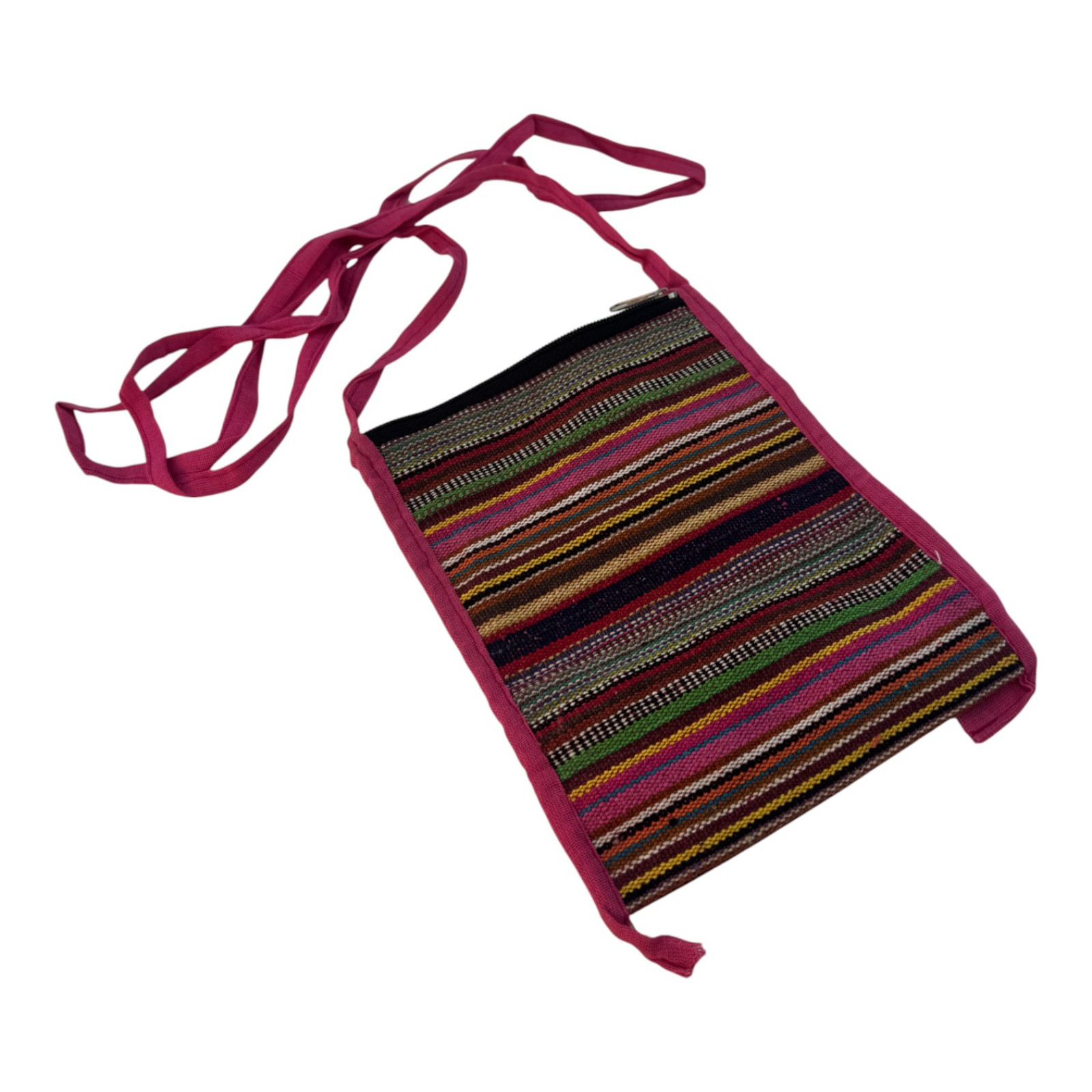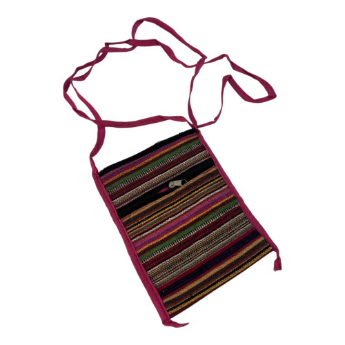 This bright and lightweight ethnic-style handbag is a great accessory for everyday use or travel. Made in India, it features colorful horizontal stripes, is soft to the touch, and comfortable to wear. The main compartment zips up, and an external zipped pocket keeps small items close at hand. Its compact size allows it to be worn over the shoulder or crossbody.