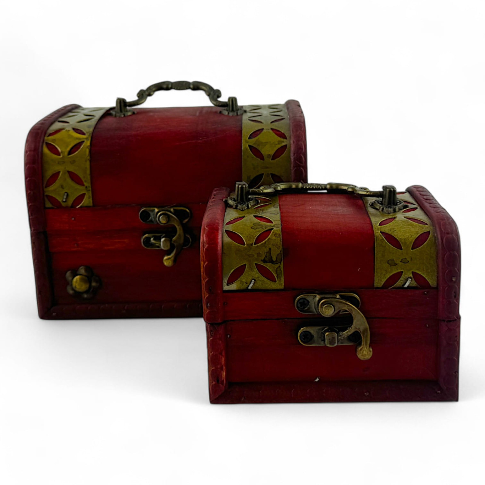 These chests are made of wood with exquisite metal decor, which gives the products a special elegance. They are equipped with reliable clasps, so their contents will always be safe. Convenient dimensions allow you to use them both for home storage and as decorative elements. Retro design and carved metal inserts add special charm to the chests.
