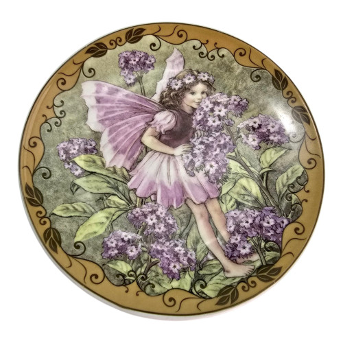The plate depicts a delicate fairy with large pink and purple wings, holding a large bouquet of lilacs. The arrangement is framed by a gold border with decorative curls and leaves. On the back of the plate is a special hook (a metal triangle) for hanging on the wall.