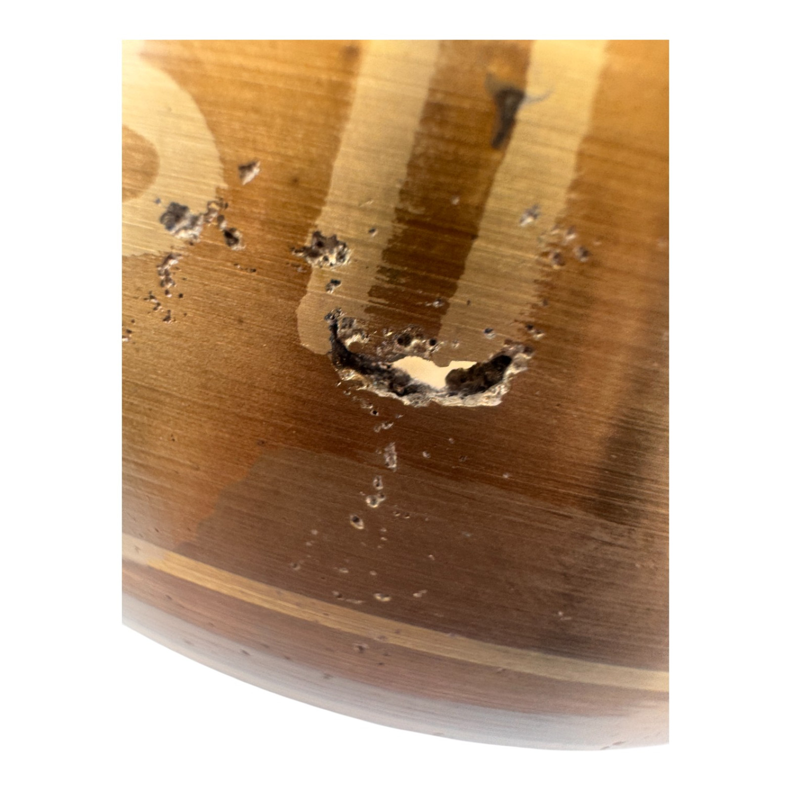This item is discounted due to a hole in the bowl. This defect is visual and does not affect the sound or functionality of the product (see photo).