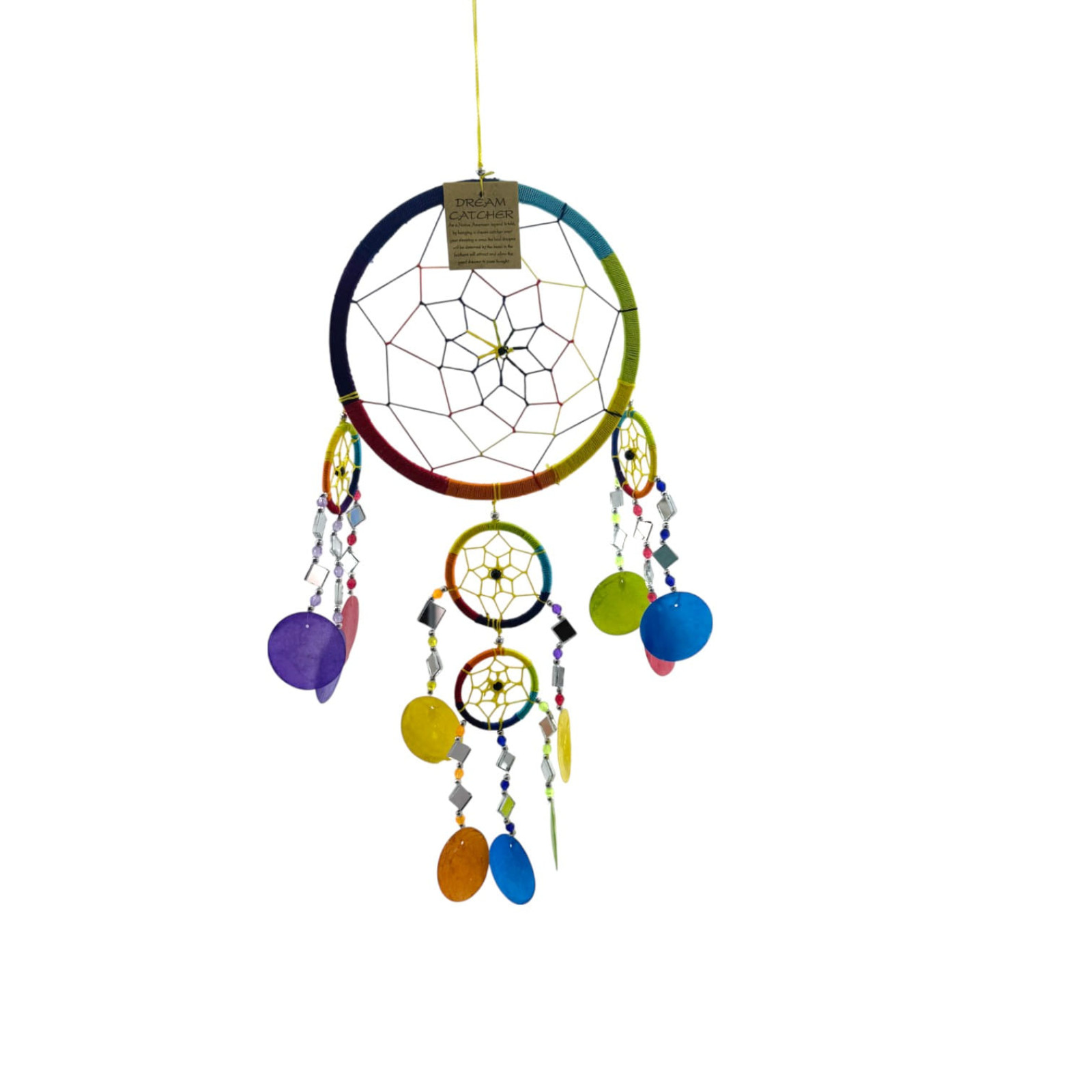 A vibrant dreamcatcher, designed in a rainbow of colours with decorative mirrors and shell pendants. It is believed to protect against bad dreams, allowing only good ones to pass through the central web.