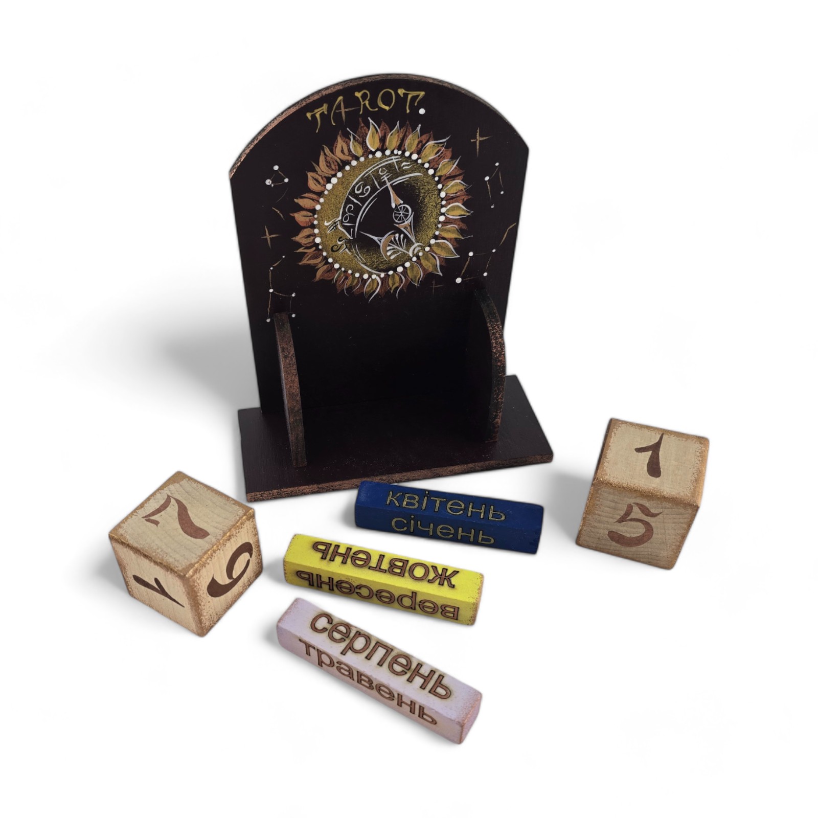 This unique perpetual calendar is made of durable wood and embodies the magic of time and the symbolism of the tarot. Each month date and month cube is handcrafted with meticulous attention to detail. Each die features patterns inspired by the mysterious images of the tarot, embodying an atmosphere of mystery and foreshadowing. The inscription "tarot" adorns the top of the calendar, emphasizing its connection with the mystical world of tarot.