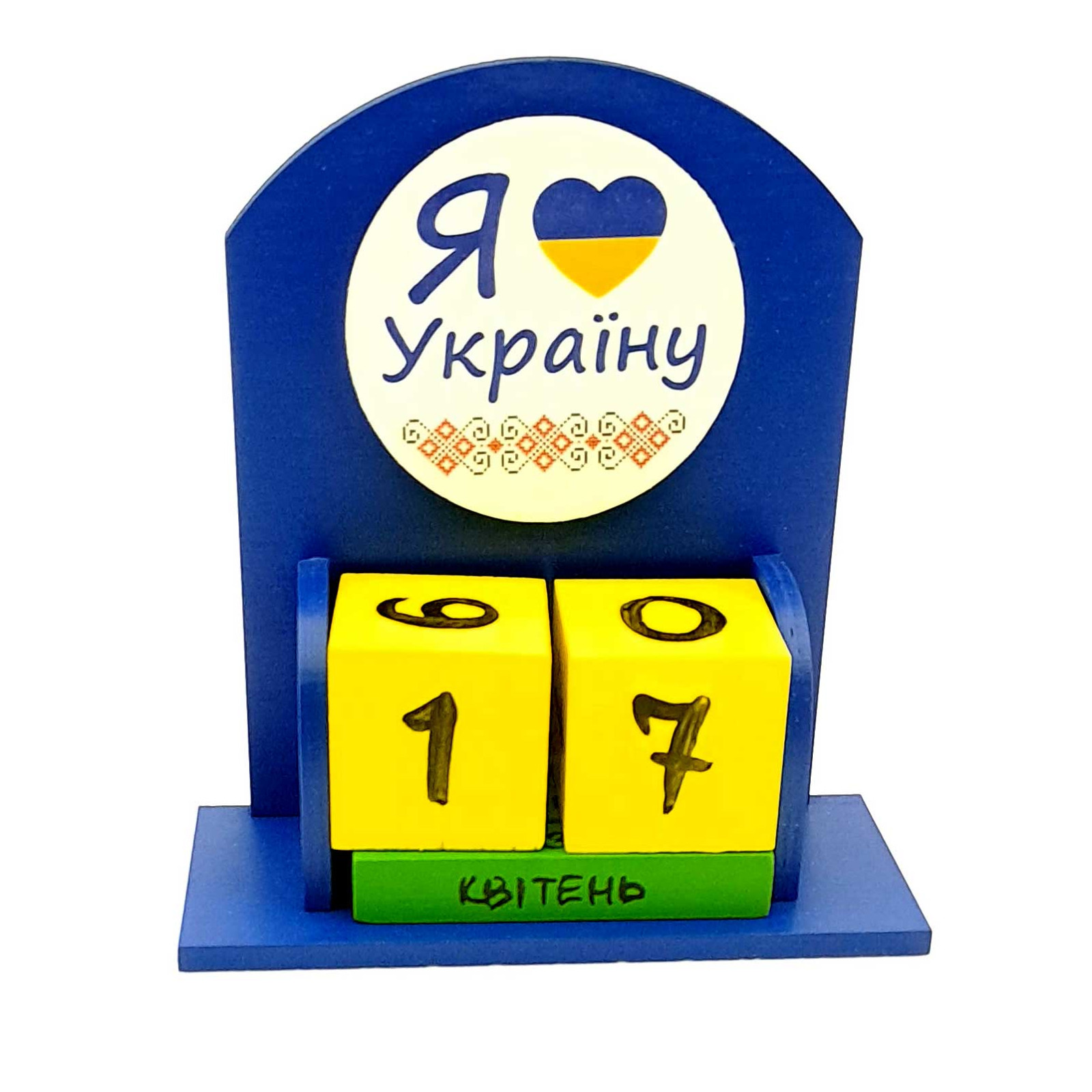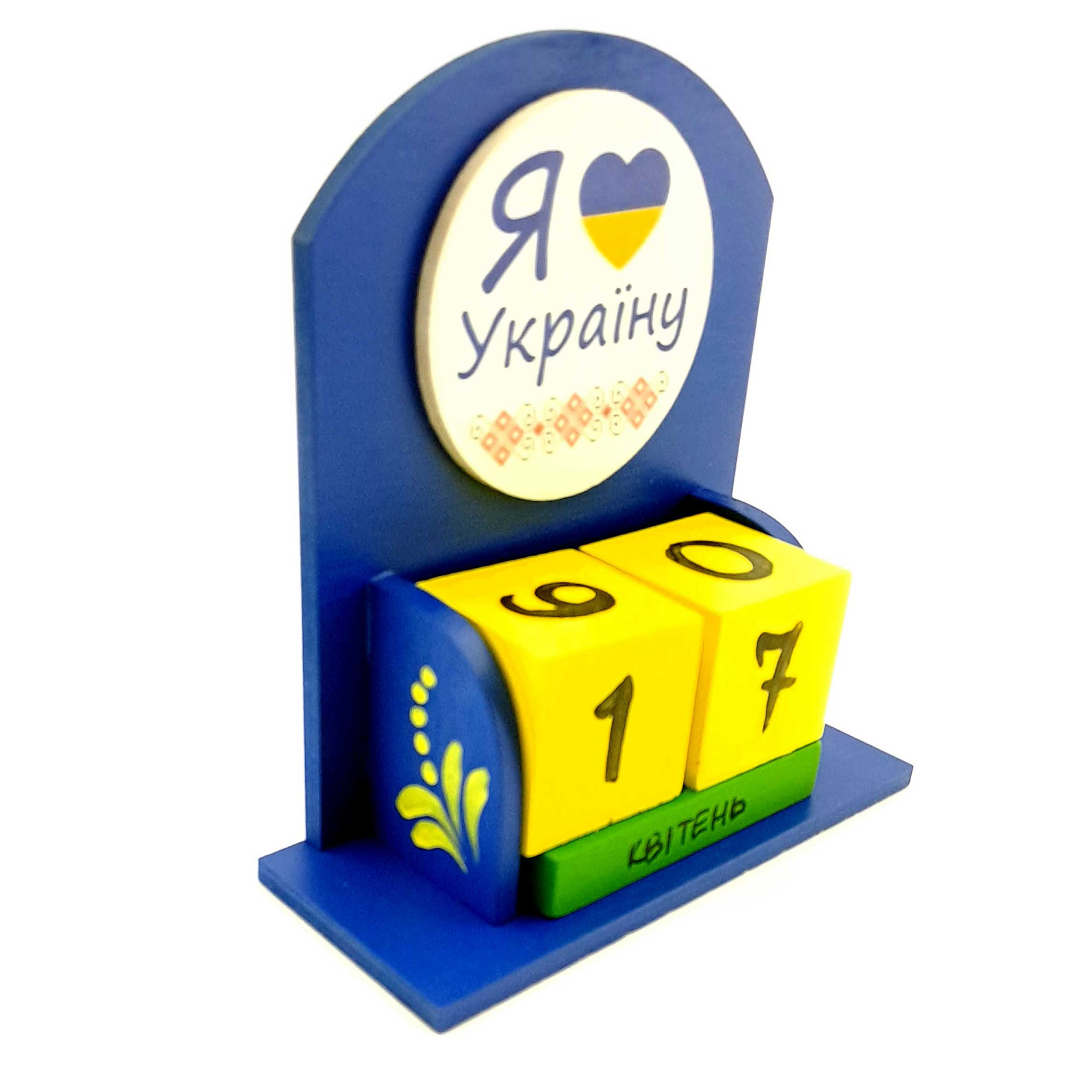 Description Eternal calendar "I love Ukraine" (155x142x60 mm), hand-painted wooden.