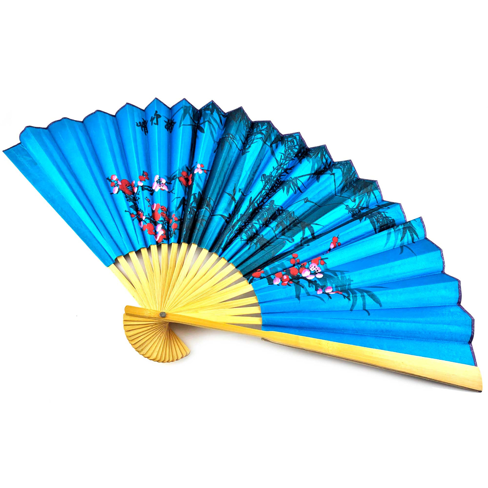 Description Bamboo fan with silk "Sakura and bamboo on a blue background"
