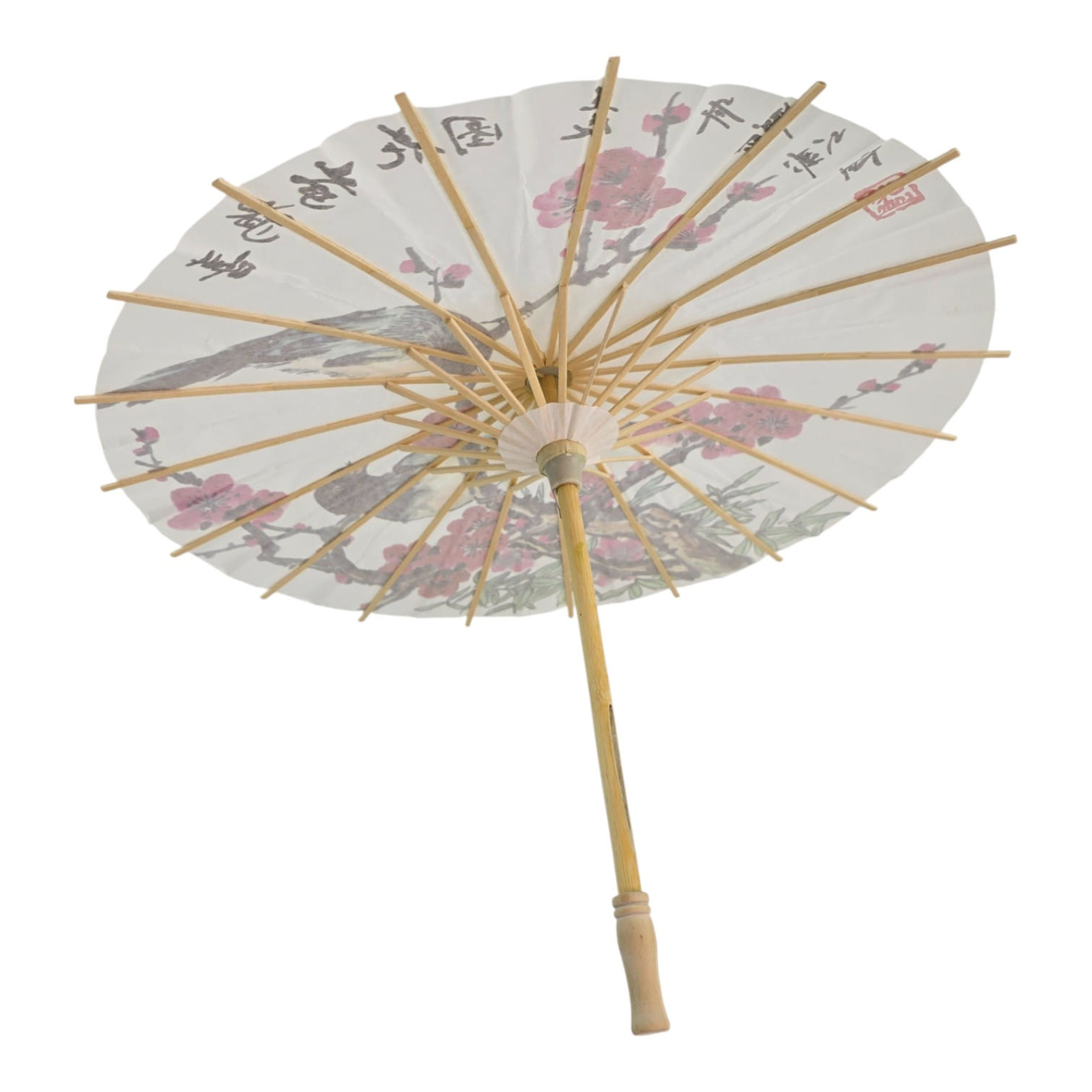 An elegant decorative umbrella in an oriental style: thin paper with a vibrant print of cherry blossoms and birds, bamboo (wood) base. Lightweight and striking, it's perfect for photo shoots, weddings, theme parties, dance performances, window dressing, and interior design. Manually opened. Provides sun protection (not waterproof or rainproof).
