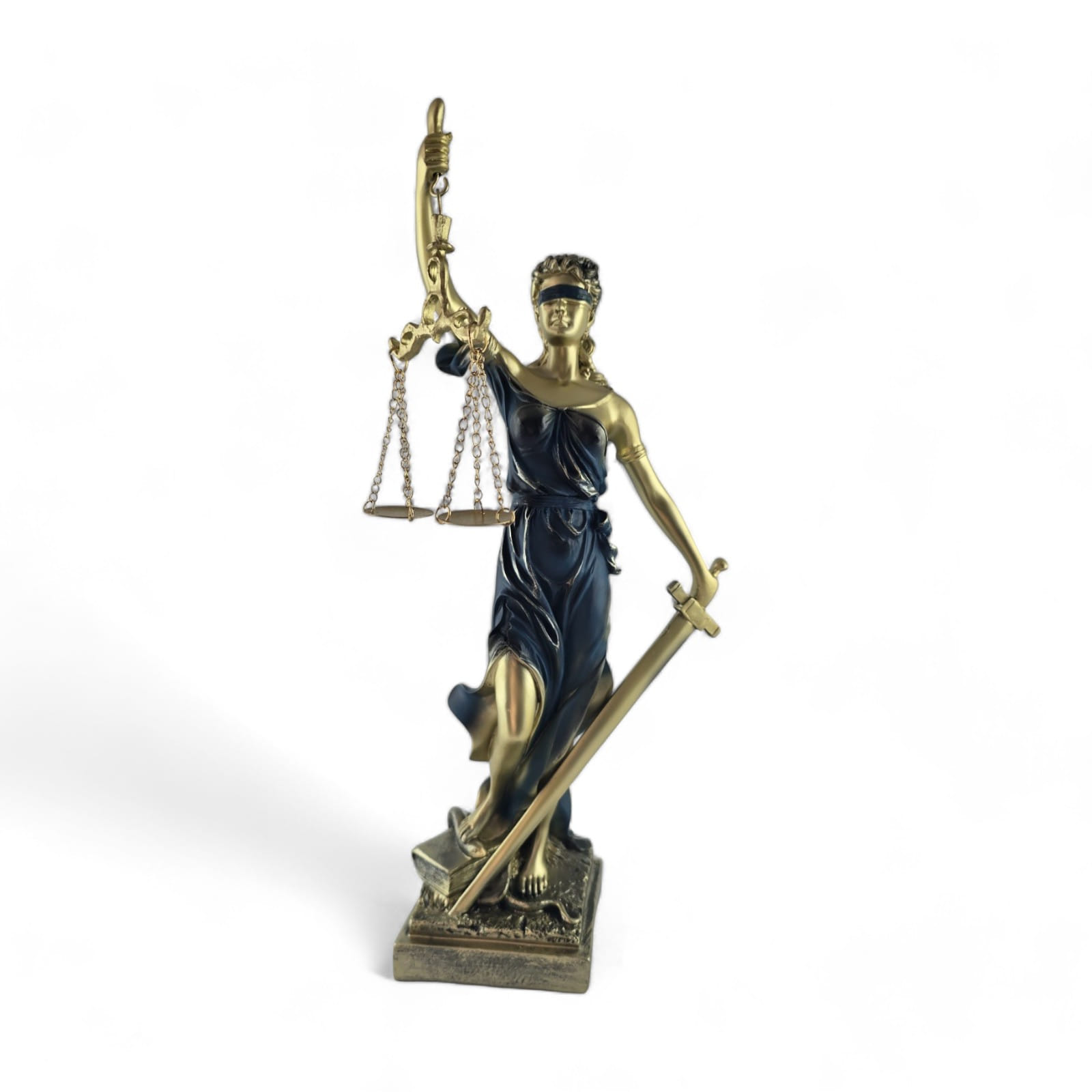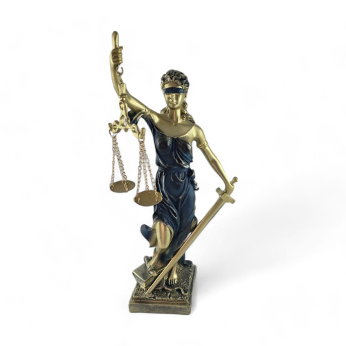 Представляем вашему вниманию статуэтку Фемиды - символа правосудия и баланса, которая изготовлена из полимера бронзового цвета в голубом платье и с повязкой на глазах. Эта замечательная скульптура поражает своей изысканностью и мастерством изготовления.