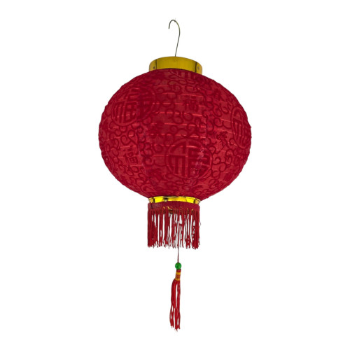 Традиционный красный фонарь для праздников и интерьеров. На корпусе вышиты иероглифы 如意吉祥 - пожелание «пусть всё будет как задумано и благополучно», символ удачи и благоприятных перемен. Рисунок с пионами означает богатство и процветание. Фонарь выполнен из плотной синтетической ткани (полиэстер) с бахромой и кистями, имеет складной металлический каркас и крючок для подвеса.