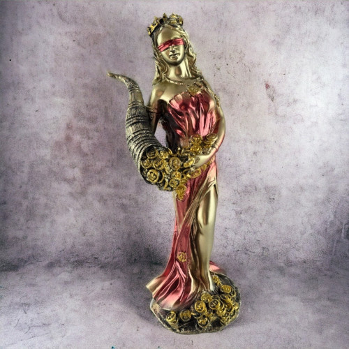 Статуэтка Фортуны излучает элегантность и статусность, воплощая в себе образ богини удачи. В золотистом наряде с красным платьем и красной повязкой на глазах, она предстает перед вами во всей своей величественной красоте.