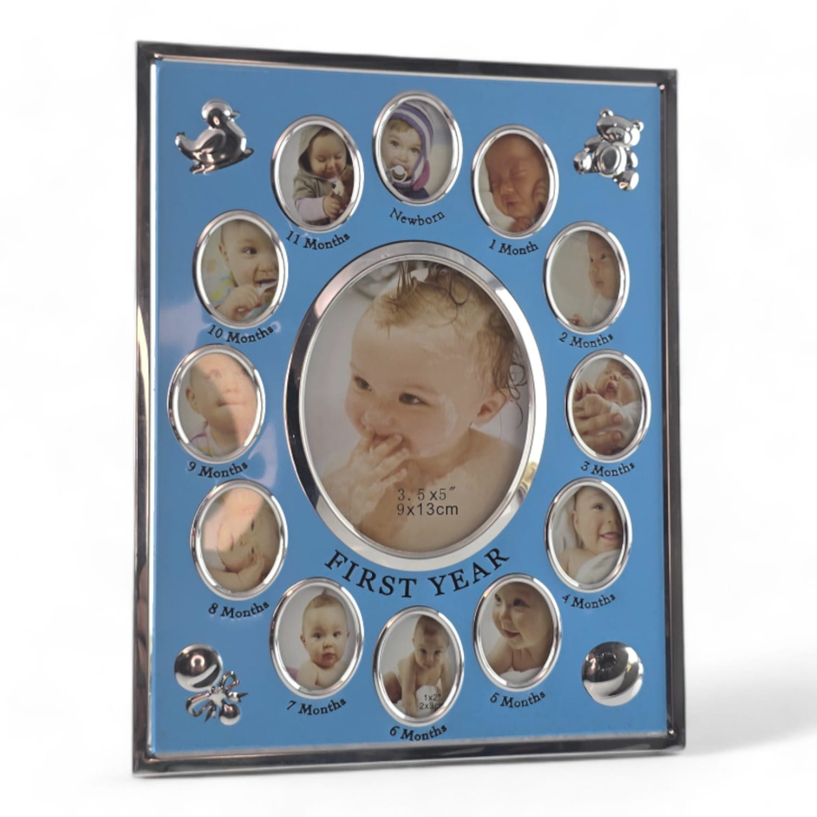 Фоторамка имеет размер 235х185х10 мм и выполнена в голубом цвете, который придает ей неповторимую изящность и нежность. Внутри фоторамки расположены 13 мест под фотографии: 12 размером 35х25 мм и одно центральное место размером 100х75 мм. Здесь вы сможете разместить самые яркие и милые снимки вашего малыша, начиная с первых дней его жизни и до года.