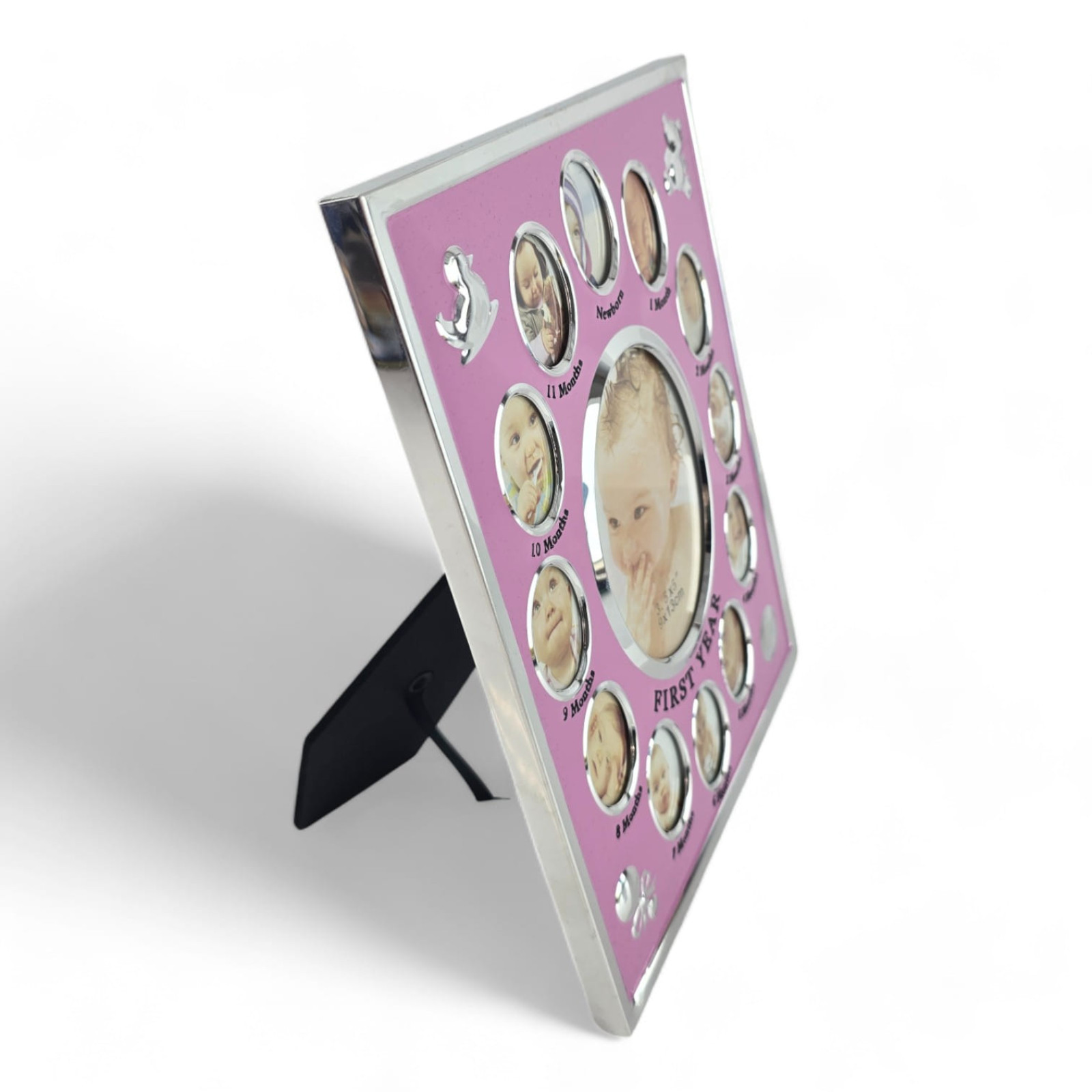 Фоторамка имеет размер 235х185х10 мм и выполнена в розовом цвете, который придает ей неповторимую изящность и нежность. Внутри фоторамки расположены 13 мест под фотографии: 12 размером 35х25 мм и одно центральное место размером 100х75 мм. Здесь вы сможете разместить самые яркие и милые снимки вашего малыша, начиная с первых дней его жизни и до года.