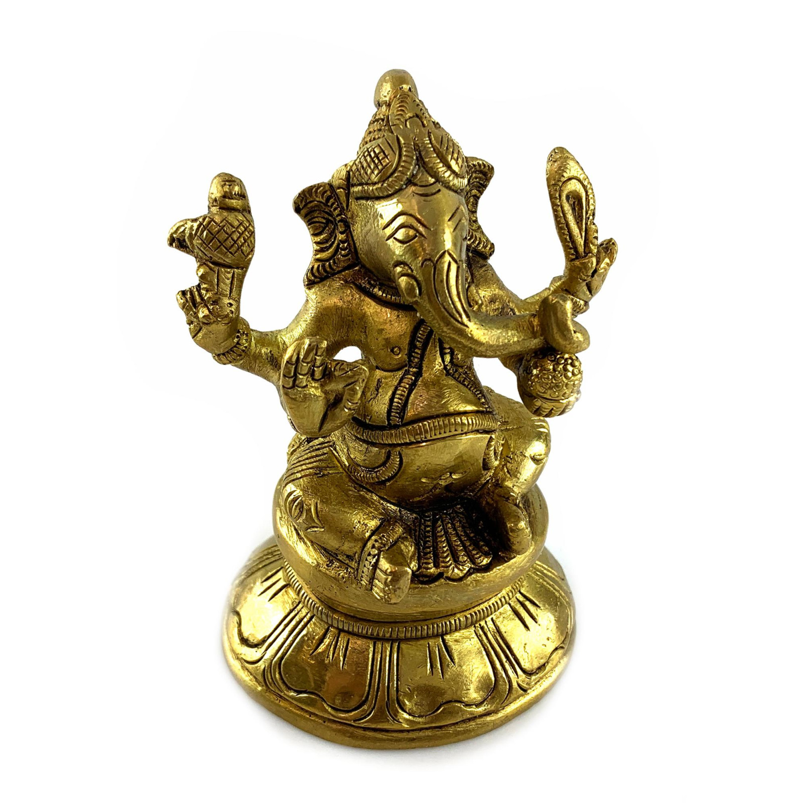 Ганеша держит в руках различные атрибуты своей многогранной личности, такие как лотос, бубенцы и абхаямудра, что символизирует защиту и снятие страха. Его присутствие привносит в ваш дом защиту и напоминает о важности мудрости в повседневной жизни.