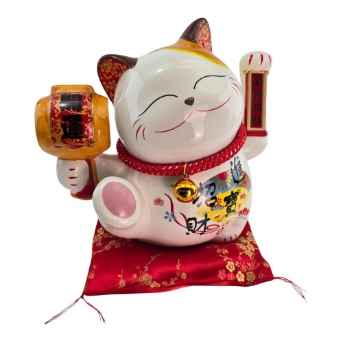 Керамический кот Манэки Нэко с поднятой лапкой, молоточком и свитком считается традиционным восточным символом удачи и финансового благополучия. Белый улыбающийся кот с цветочным орнаментом и красным шнурком с колокольчиком создаёт в помещении тёплую и дружелюбную атмосферу. Фигурка устанавливается на отдельную декоративную подушечку красного цвета с золотистым узором и сразу выглядит как готовый подарок.