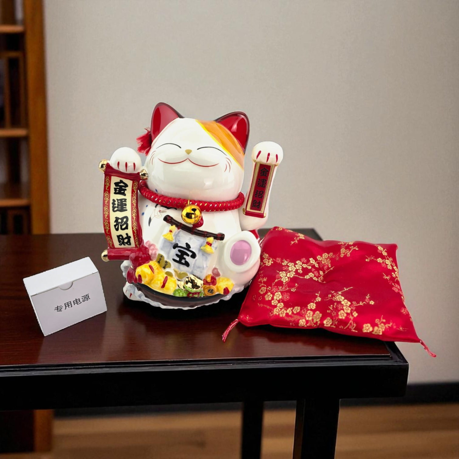 Классический кот Манэки-Нэко для привлечения удачи и достатка. Может работать от электросети или от батареек, поэтому удобно ставить на стойке ресепшен, в магазине или дома. В комплекте декоративная красная подушечка и шнур питания 85 см.