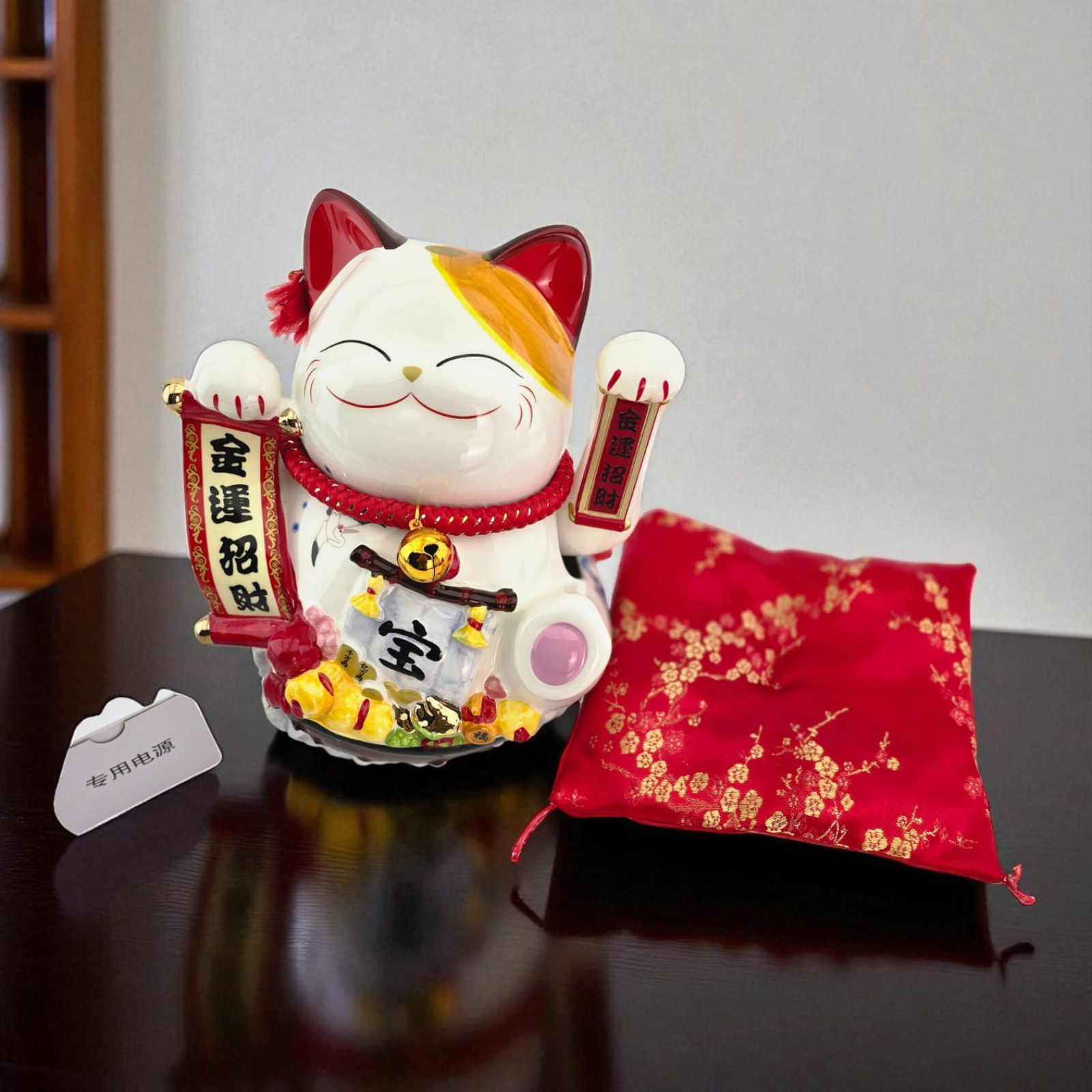 Характеристики Кот Манэки-Нэко керамический, статуэтка на удачу с подушечкой, 23,5 см, питание от сети или батареек