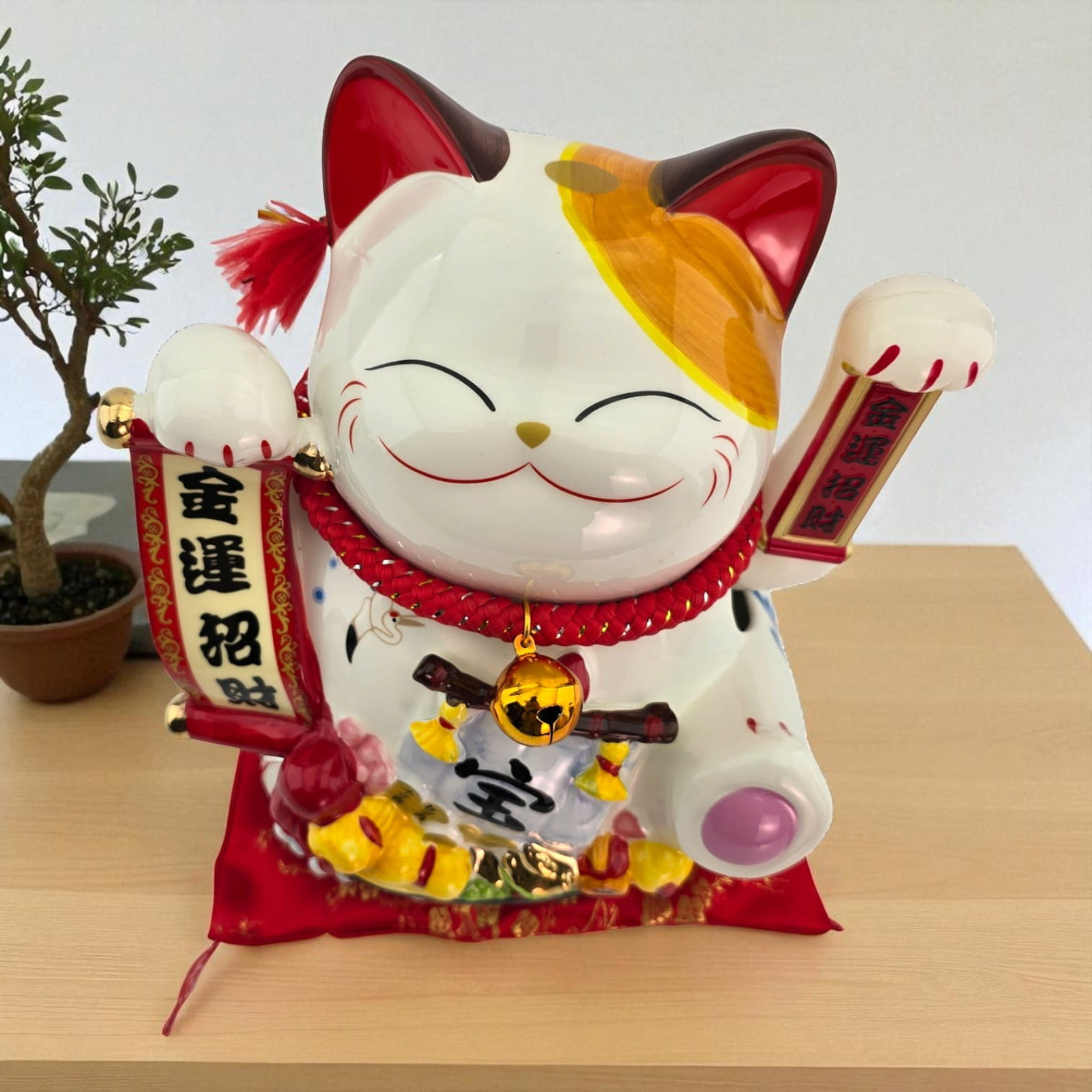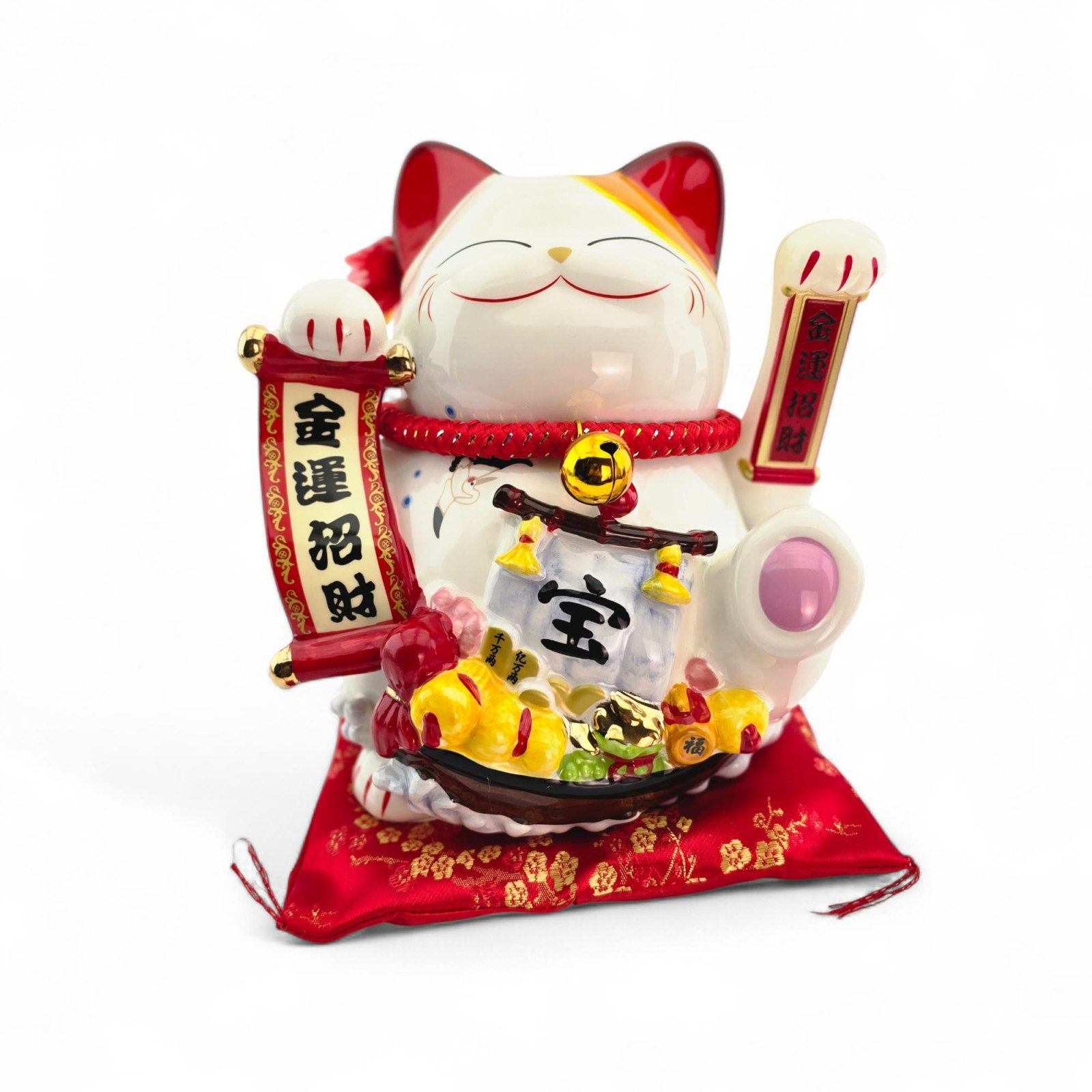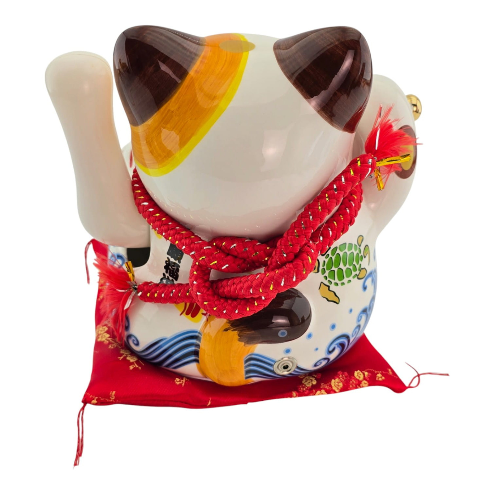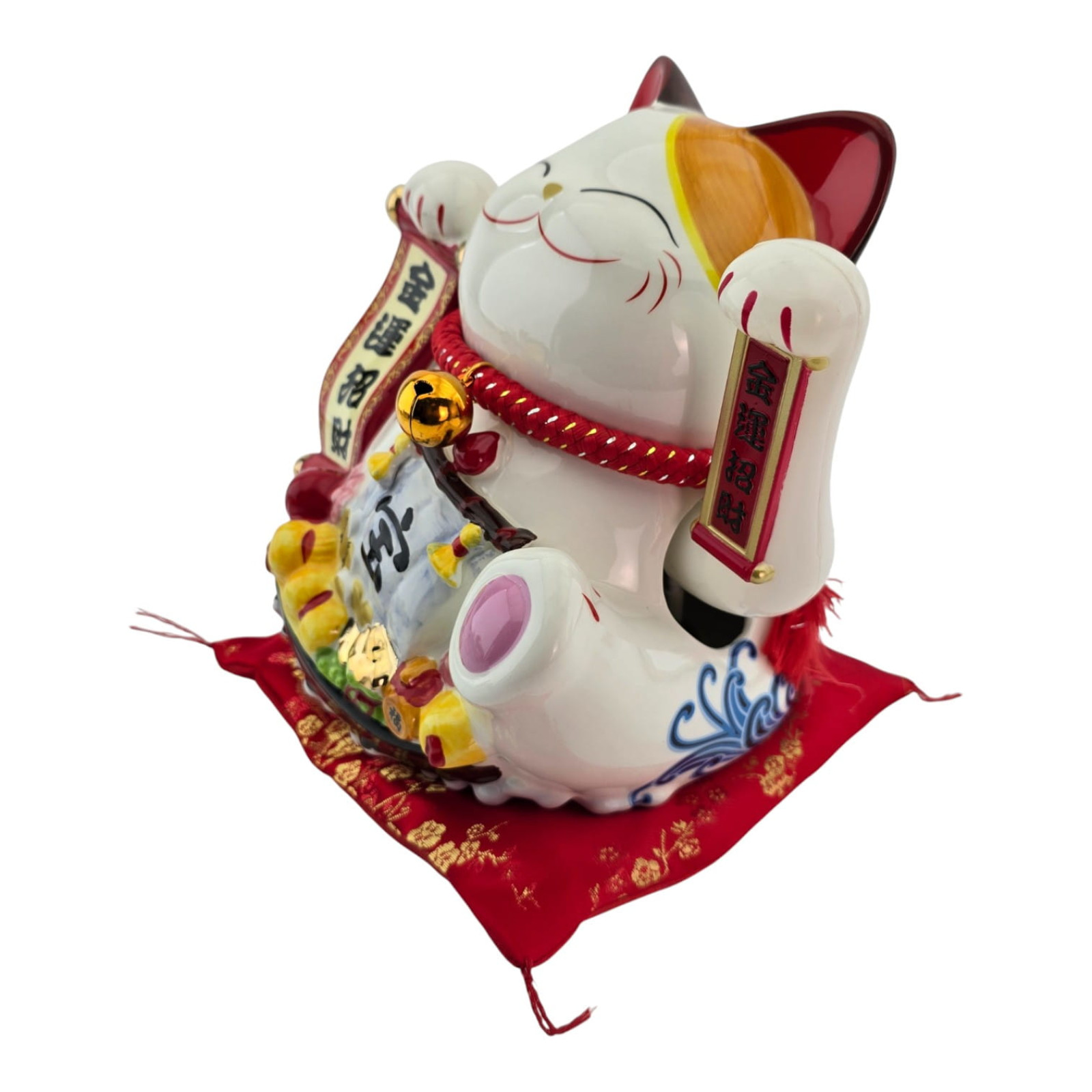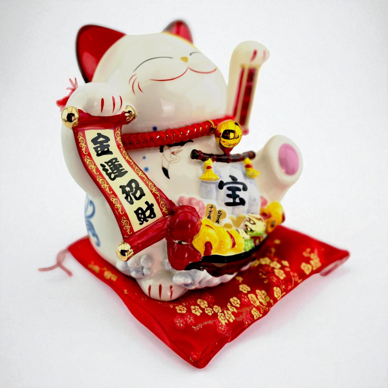 Описание Кот Манэки-Нэко керамический, статуэтка на удачу с подушечкой, 23,5 см, питание от сети или батареек