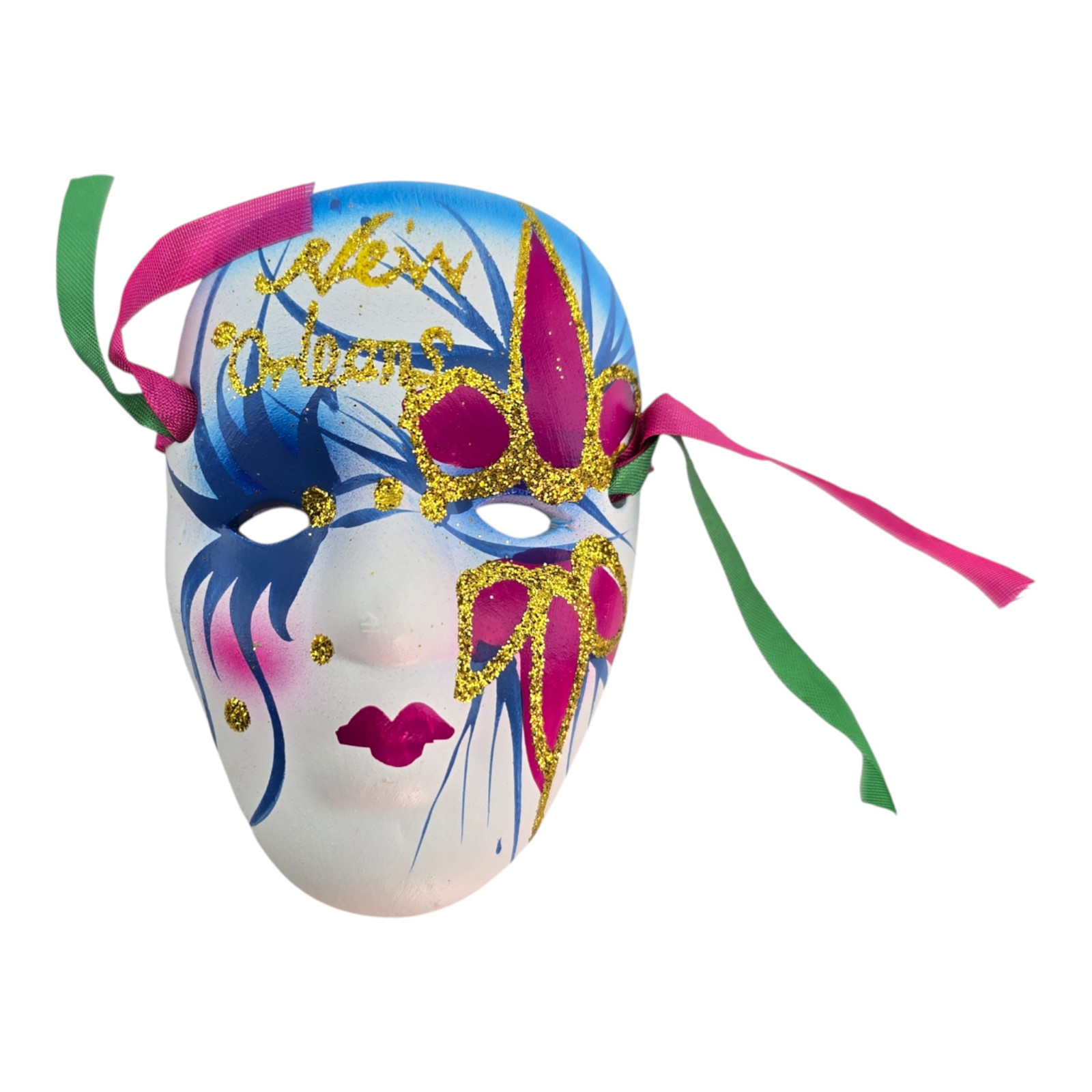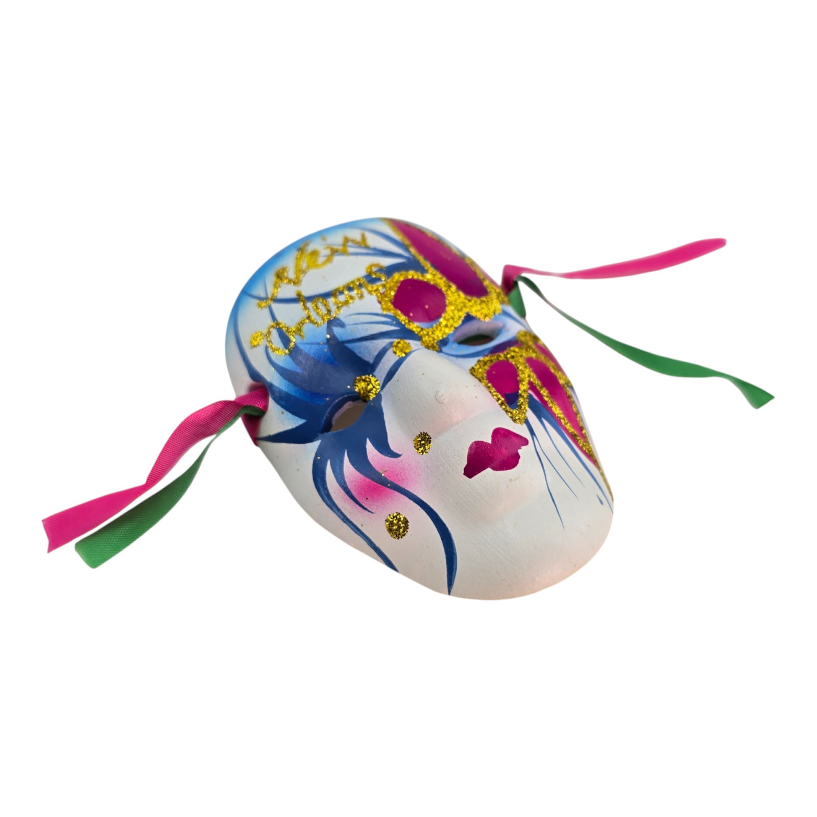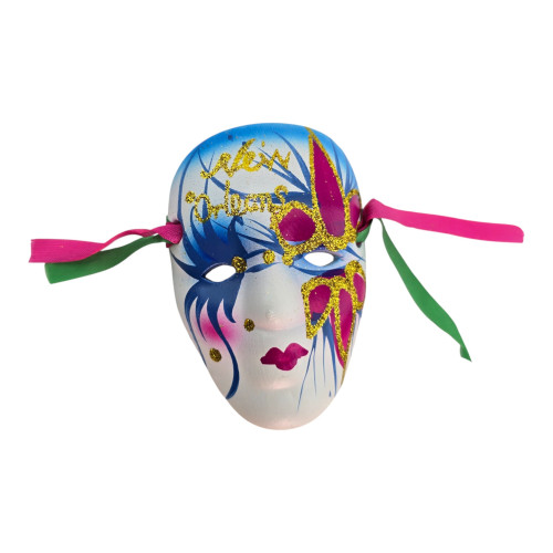 Декоративная маска в карнавальном стиле с яркой росписью и блестками. Компактный формат удобен для интерьерного декора, тематических фотозон и праздничных композиций. Ленты позволяют подвесить маску или закрепить ее на декоре (витрина, гирлянда, подарочное оформление). Подходит как сувенир или небольшой символический подарок.