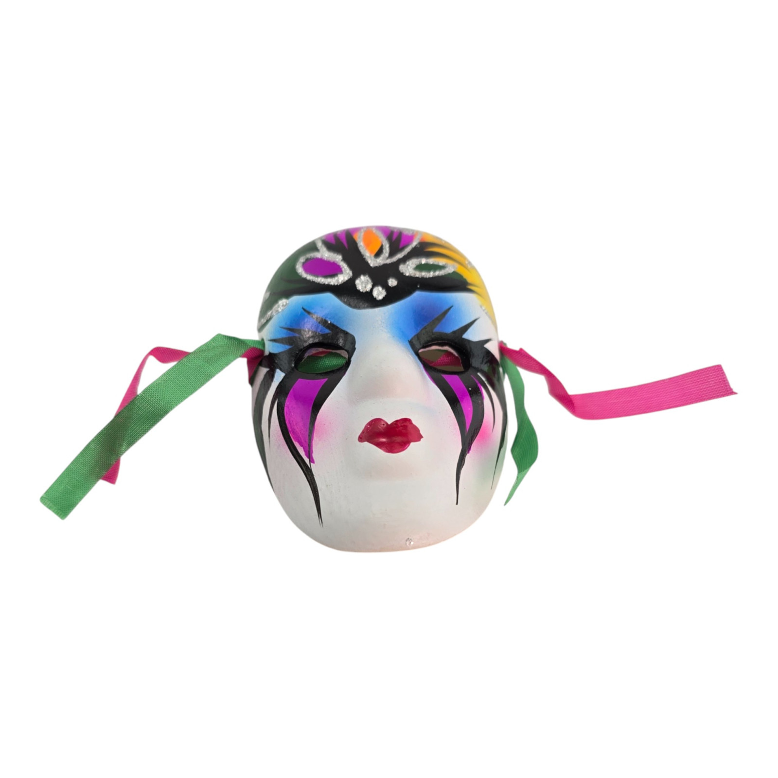 Небольшая венецианская маска из керамики с яркой росписью, блестками и ленточками для завязки или подвешивания. “Венецианскими” такие маски называют из-за карнавальной традиции Венеции, где маска стала символом праздника, тайны и смены образа. В интерьере такая вещь добавляет ощущение карнавала и работает как заметный акцент.