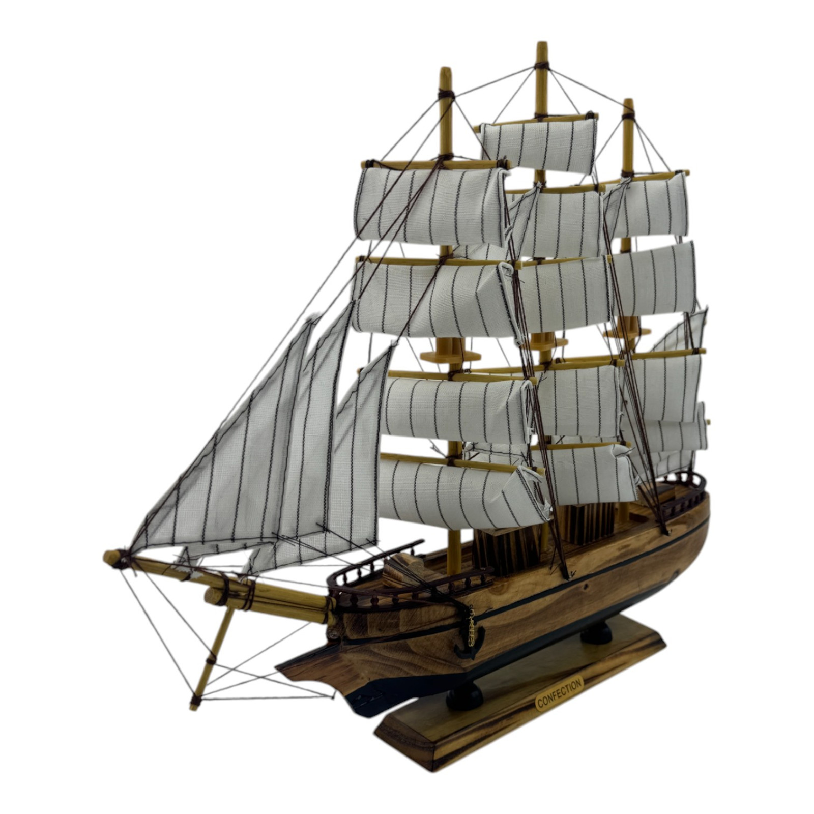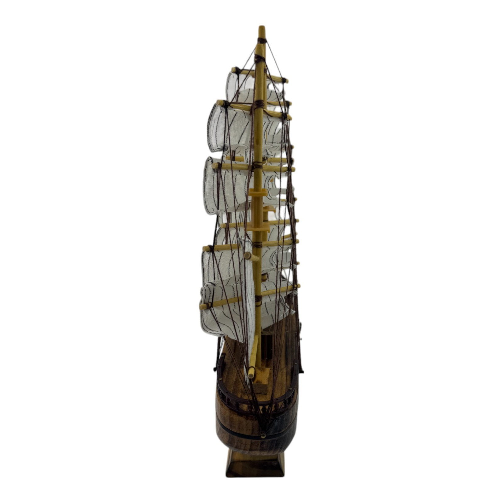 Изящные паруса и продуманные детали мачт создают ощущение лёгкости и движения, словно этот маленький кораблик готов отправиться в далёкое плавание. Модель оснащена деревянной подставкой, которая добавляет устойчивости и делает её удобной для размещения.