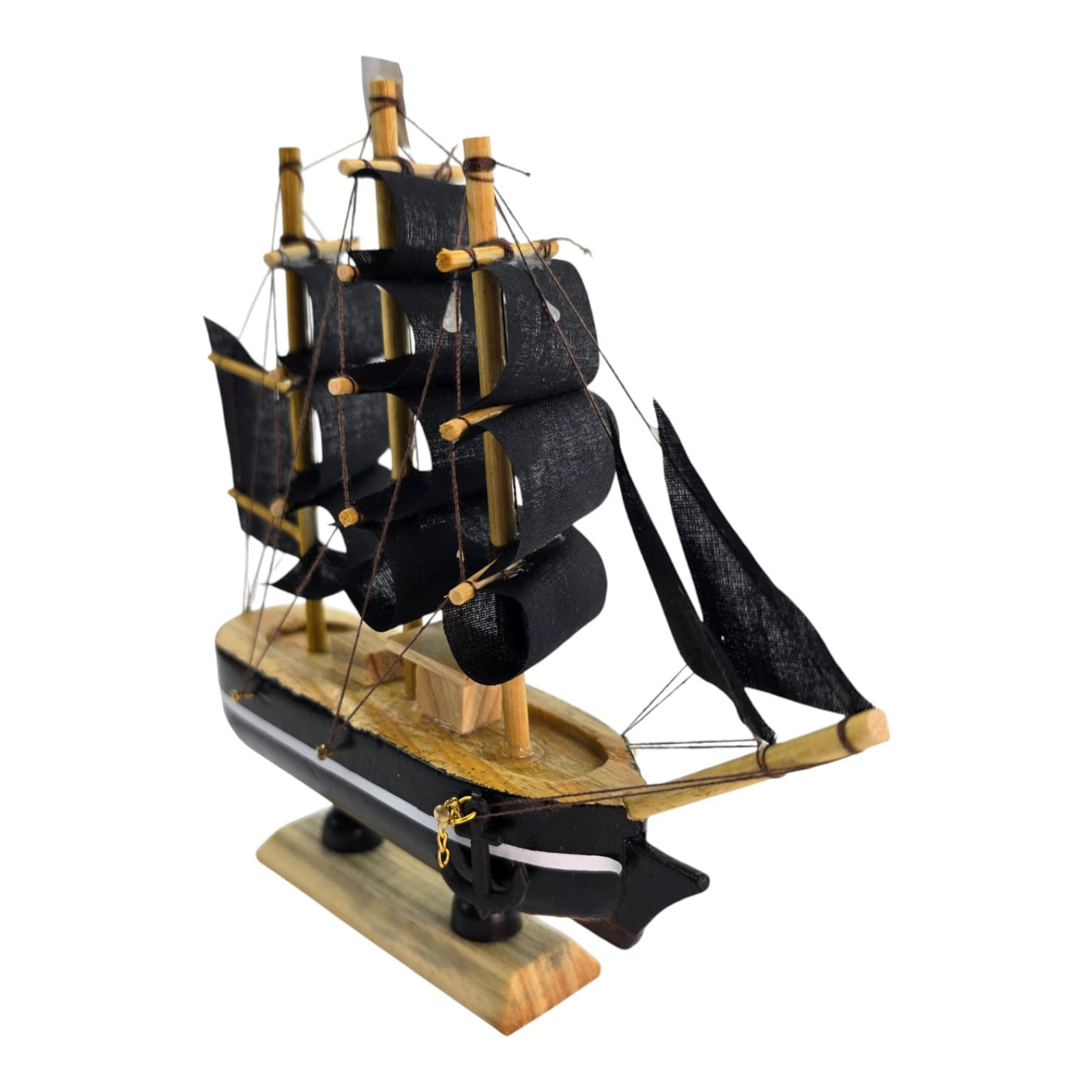 Миниатюрный деревянный корабль с чёрными парусами - эффектный акцент для стола, полки или камина. Символизирует путешествия, свободу, смелость и движение к цели; в рабочем пространстве считается талисманом успеха и новых возможностей. «Пиратские» паруса придают композиции драйв и атмосферу приключений. Аккуратная модель на подставке из дерева и ткани.