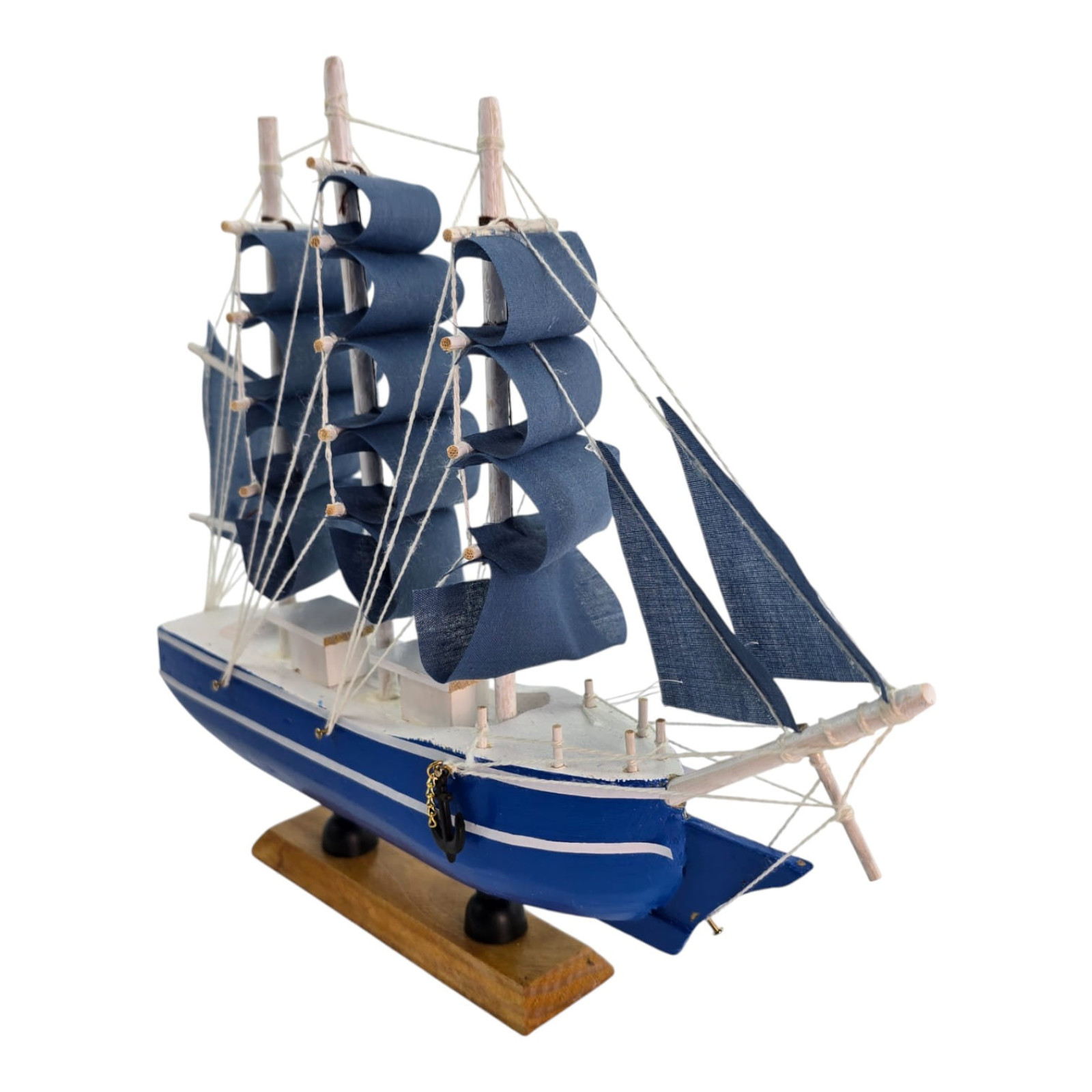 Настольная модель парусного корабля в сине-белой гамме. Деревянный корпус и мачты, тканевые паруса и шнуровый такелаж создают выразительный морской акцент для полки, камина или рабочего стола. Отличный подарок любителям морской тематики и стильный элемент интерьера.