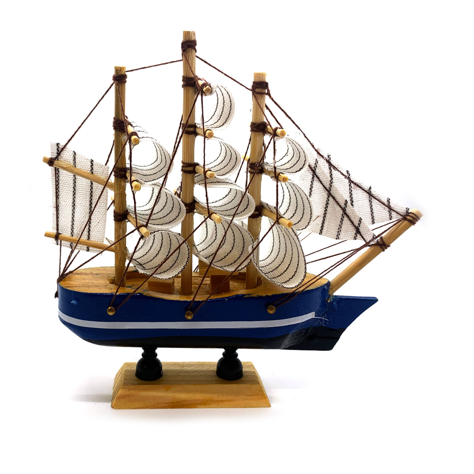 Синий с белой полосой корабль на подставке, который станет прекрасным украшением для вашего рабочего стола, полки или отличным подарком для любителей морской тематики.