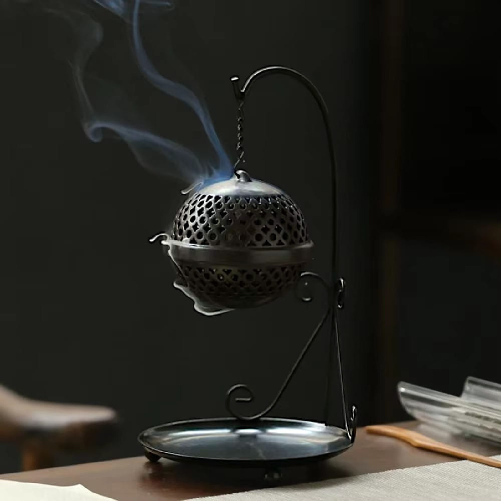 Эта изящная подставка для благовоний выполнена в виде полусферической ажурной конструкции, подвешенной на изящном металлическом штативе. Ее утонченный дизайн гармонично сочетается с практичностью: отверстия в куполе позволяют дыму благовоний легко распространяться, создавая атмосферу уюта и спокойствия. Нижняя тарелочка служит для сбора пепла, сохраняя чистоту поверхности. Идеальное решение для тех, кто ценит эстетику и комфорт в интерьере, создавая уголок для медитации и расслабления.