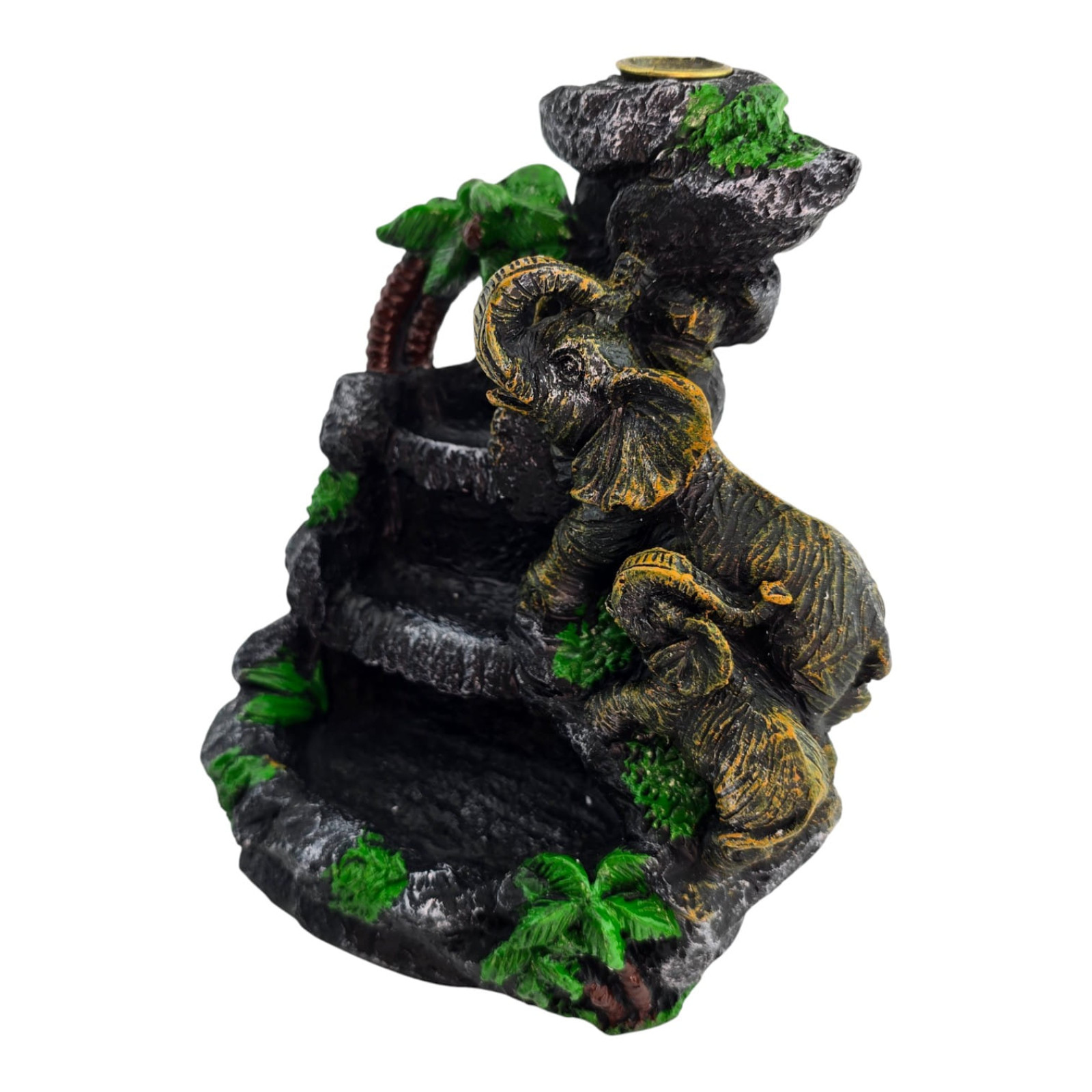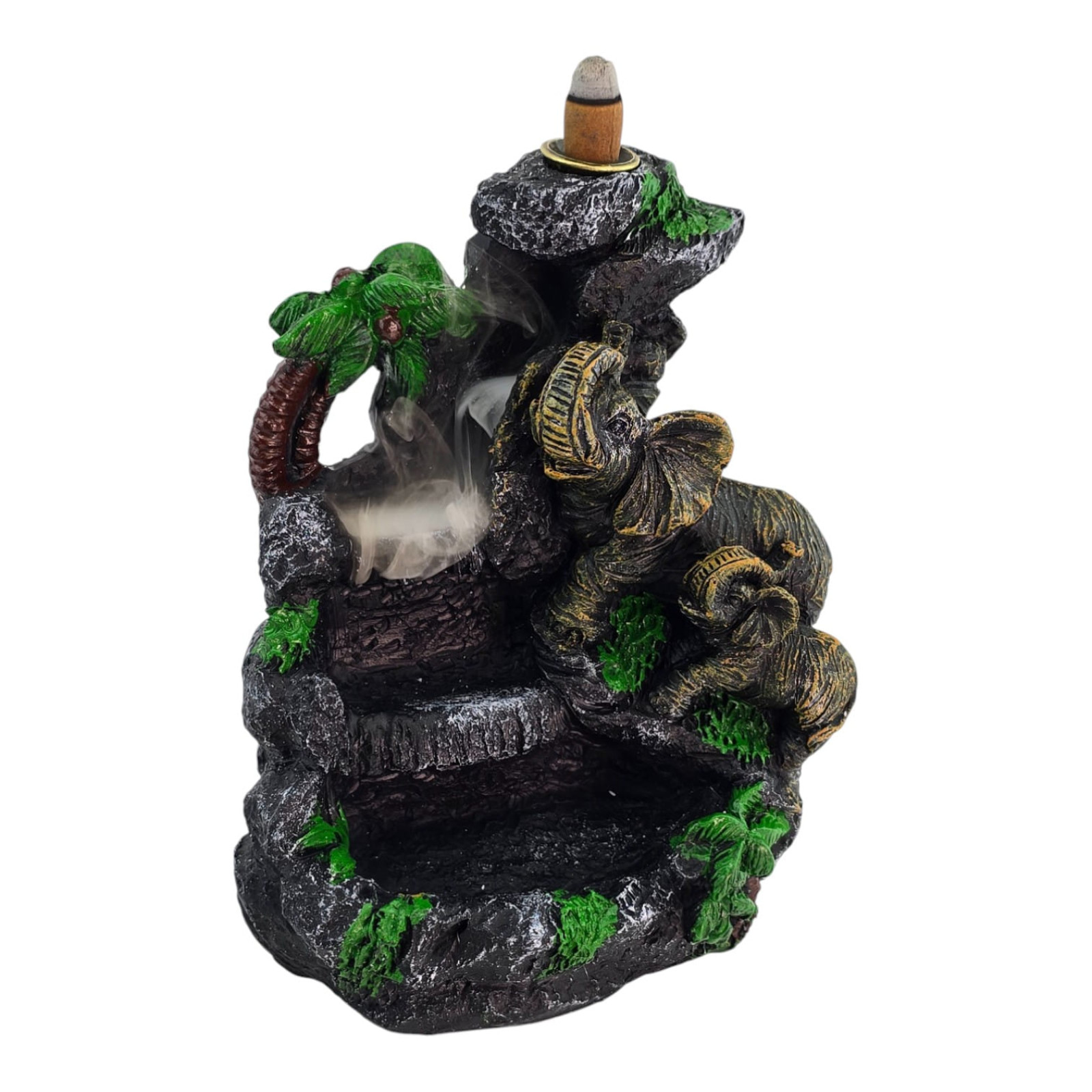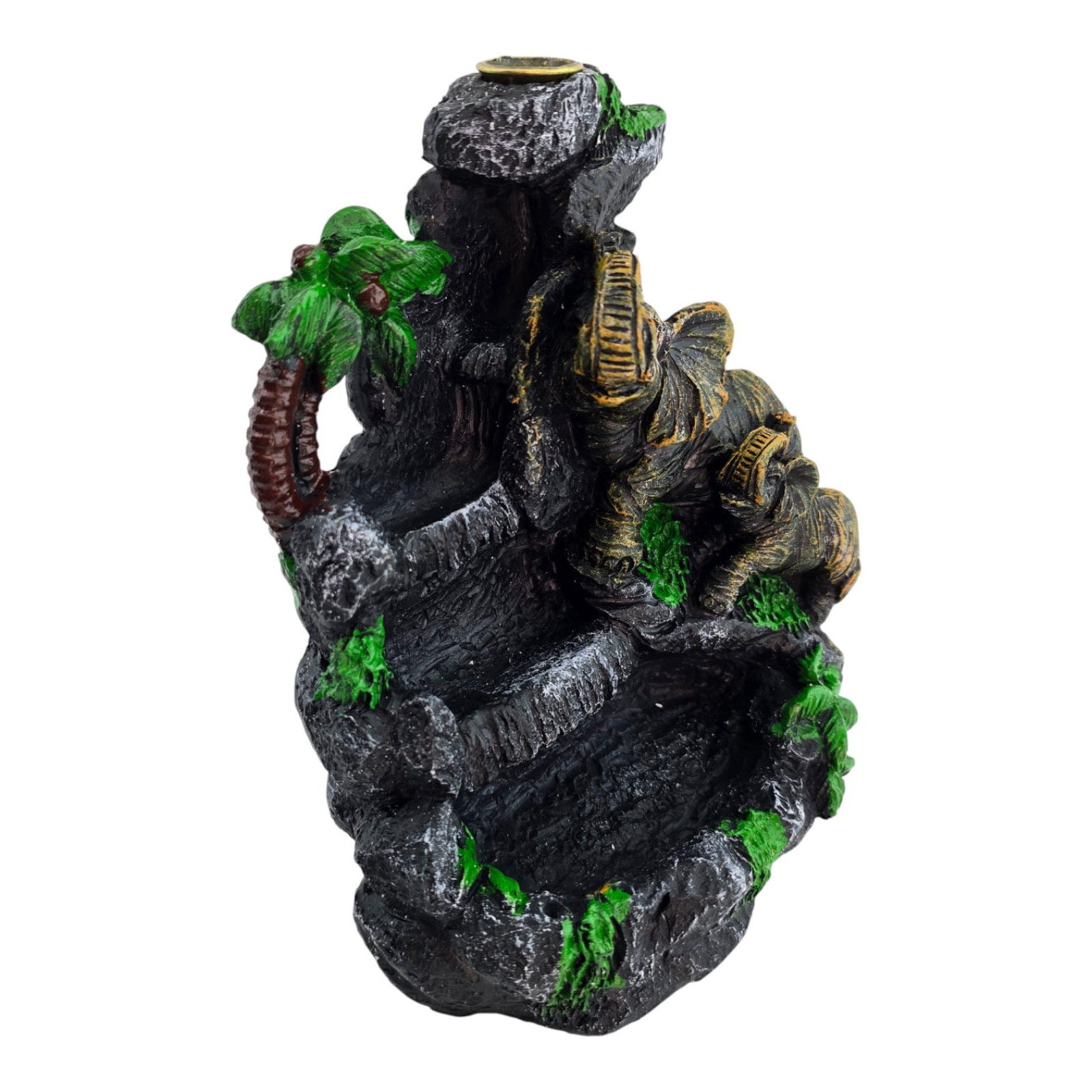 Декоративная подставка виде скал с пальмами и слонятами. Рассчитана на один backflow-конус: после розжига дым мягко стекает каскадами вниз, создавая эффект «водопада». Подходит для медитации, йоги, релакса и как стильный декор дома. Используйте только конусы обратного дыма.