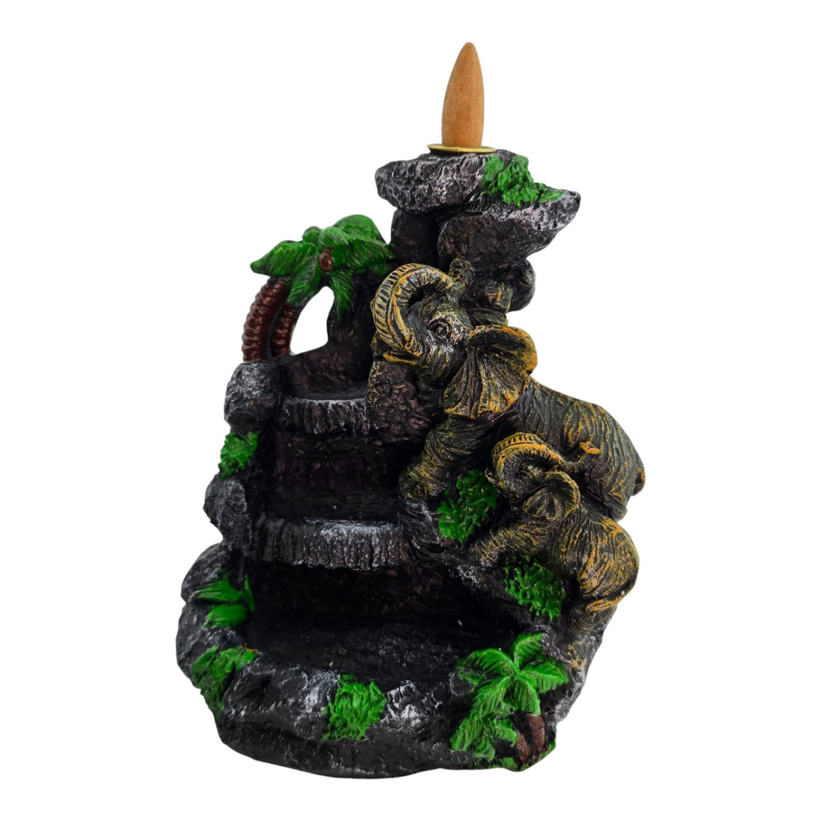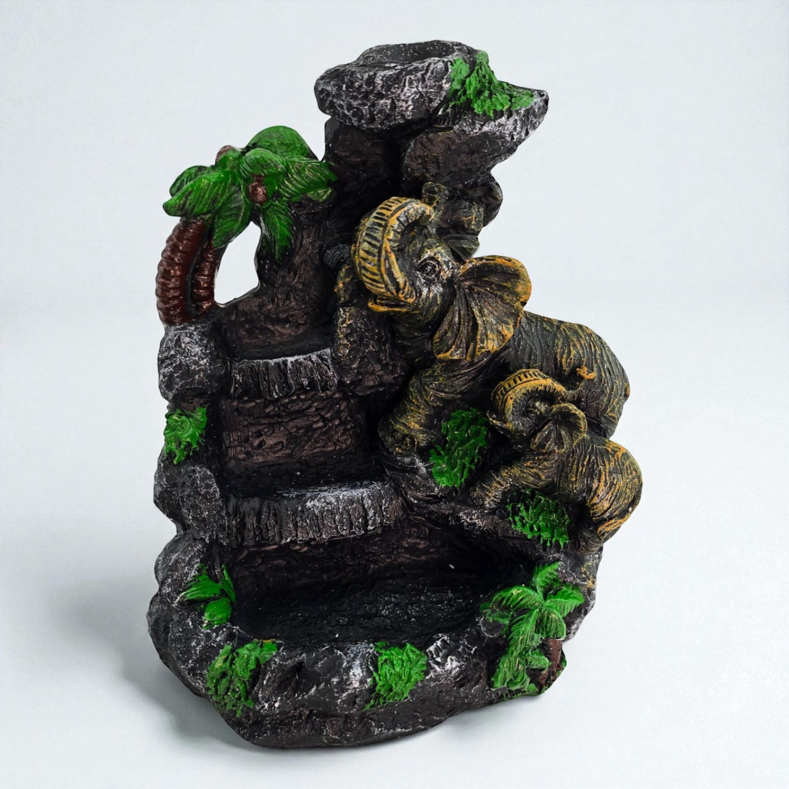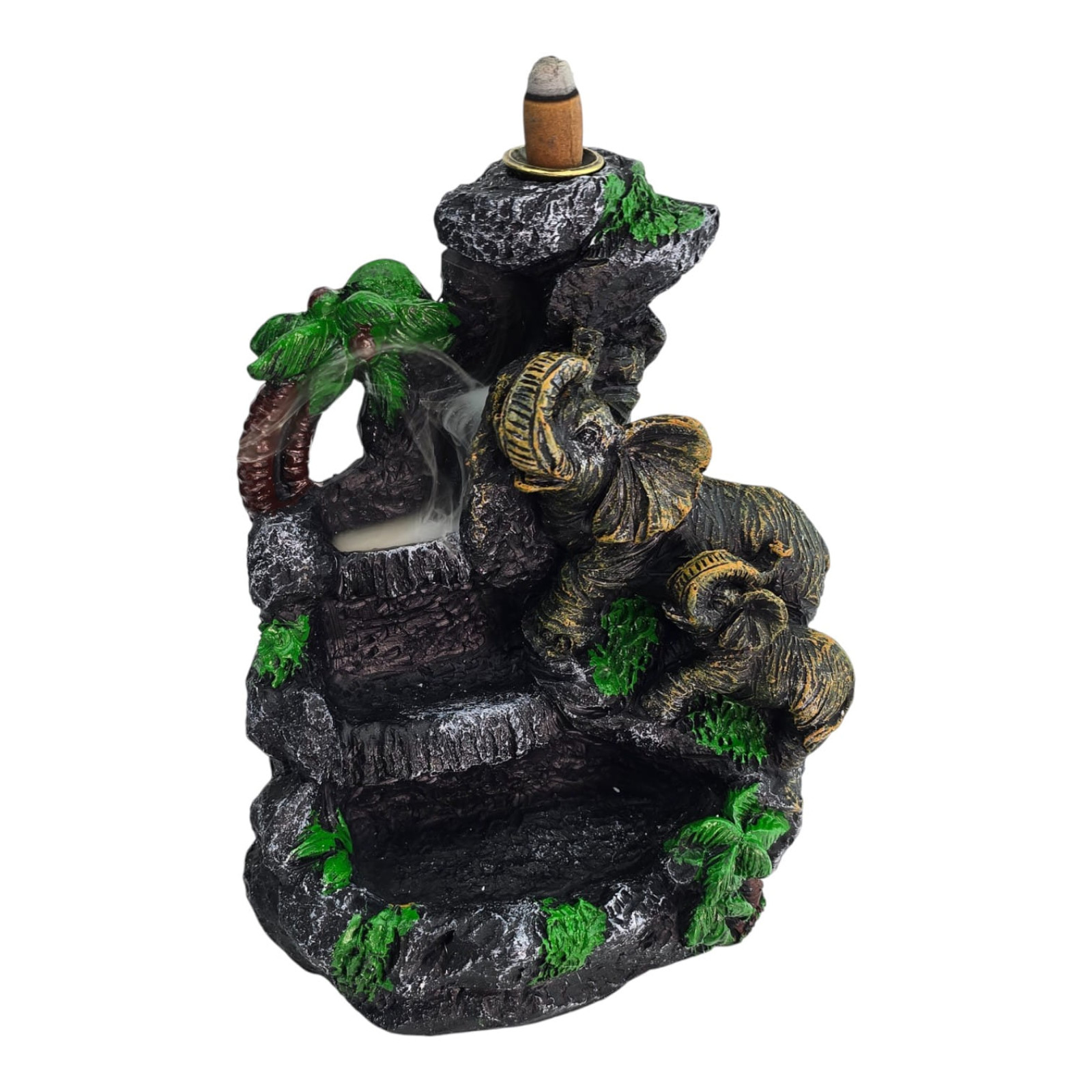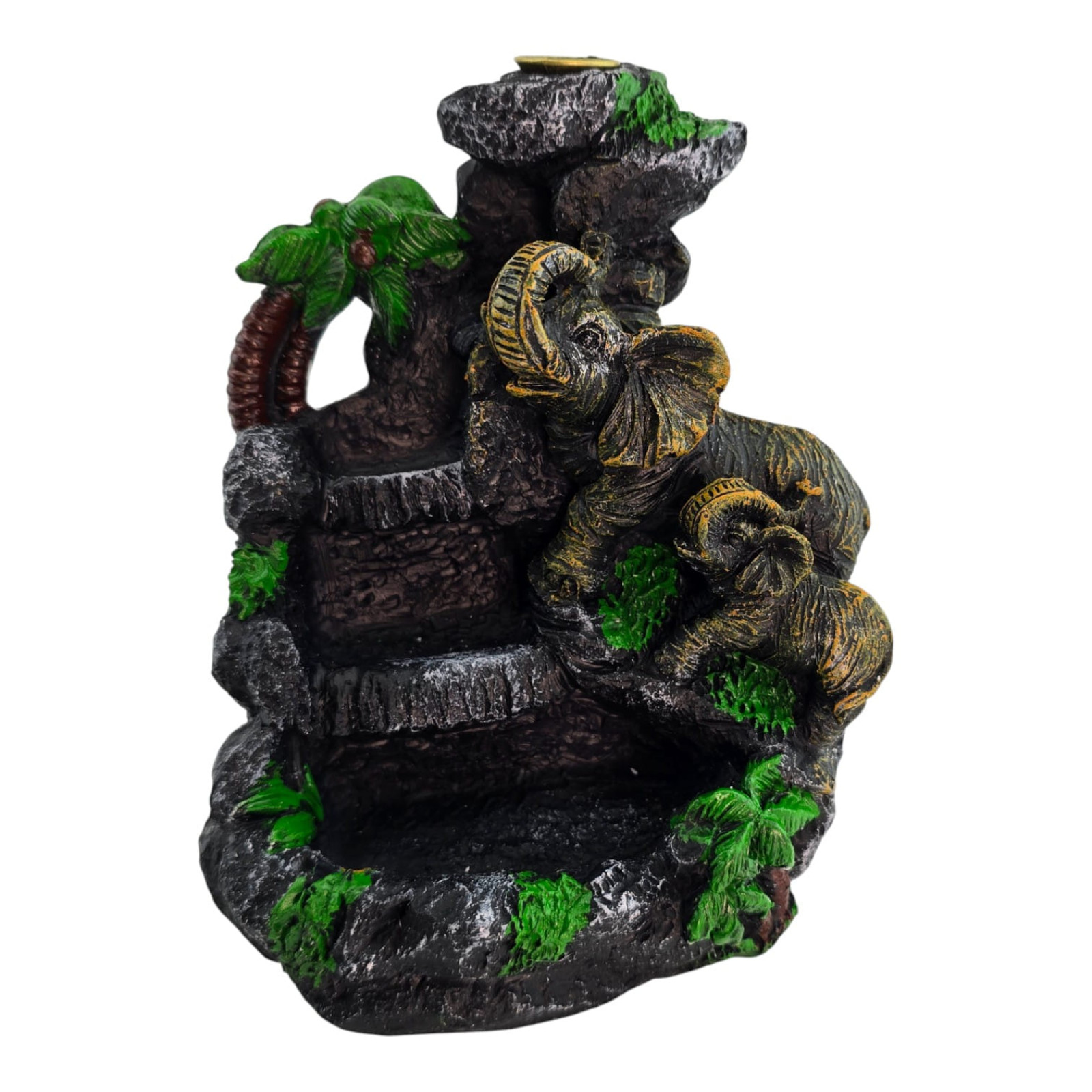 Декоративная подставка виде скал с пальмами и слонятами. Рассчитана на один backflow-конус: после розжига дым мягко стекает каскадами вниз, создавая эффект «водопада». Подходит для медитации, йоги, релакса и как стильный декор дома. Используйте только конусы обратного дыма.